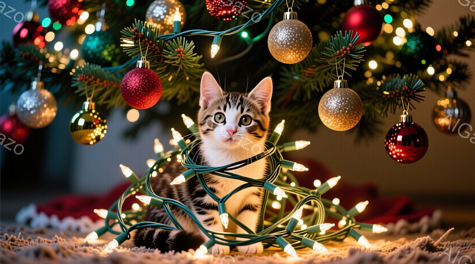 白と茶色の縞模様の小さな子猫が、クリスマスツリーのイルミネーションライトにからまりながら座っています。子猫は丸い瞳でカメラを見つめ、少し困ったような、可愛らしい表情をしています。背景には赤いオーナメントと緑の葉が飾られたクリスマスツリーがあり、温かく、お祝いの雰囲気が漂っています。