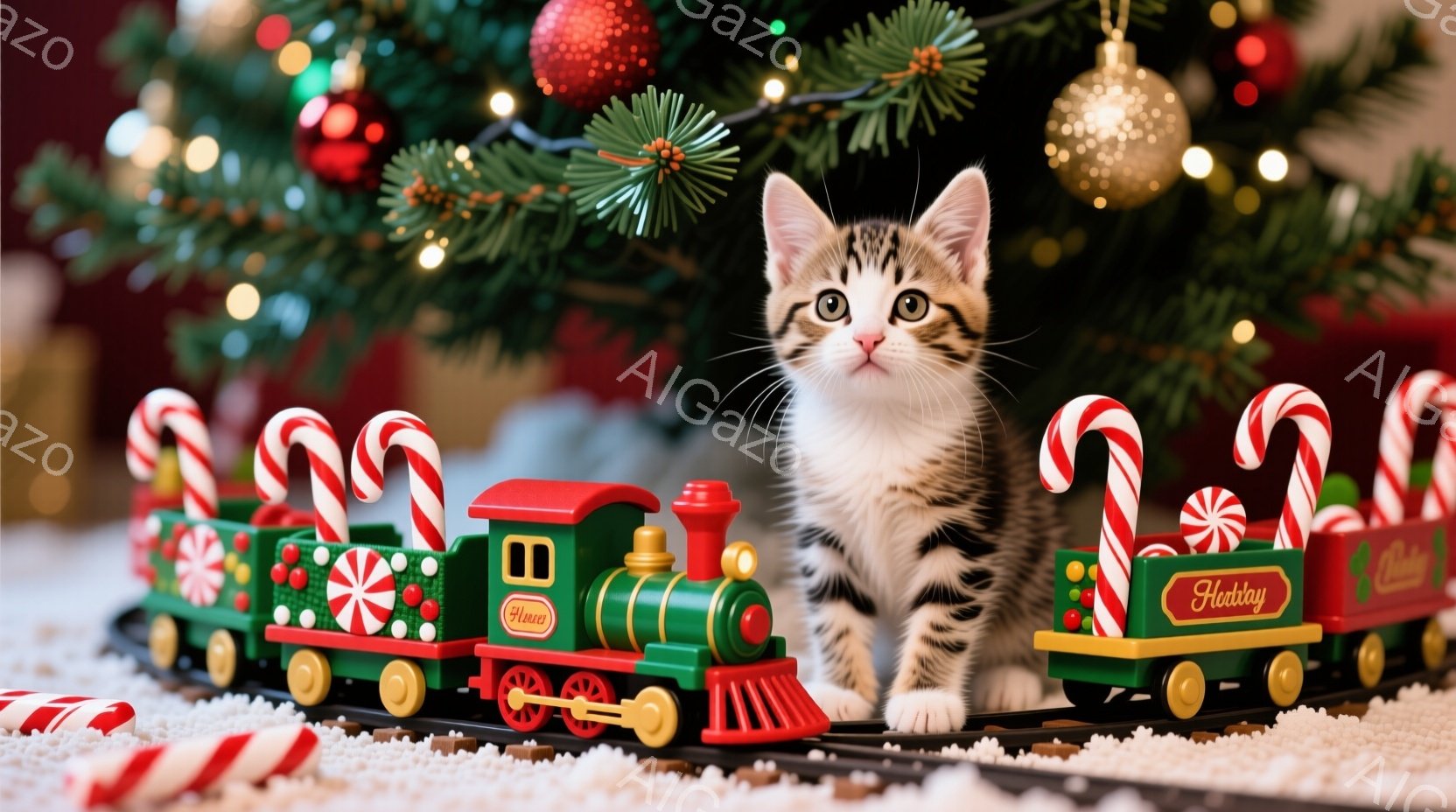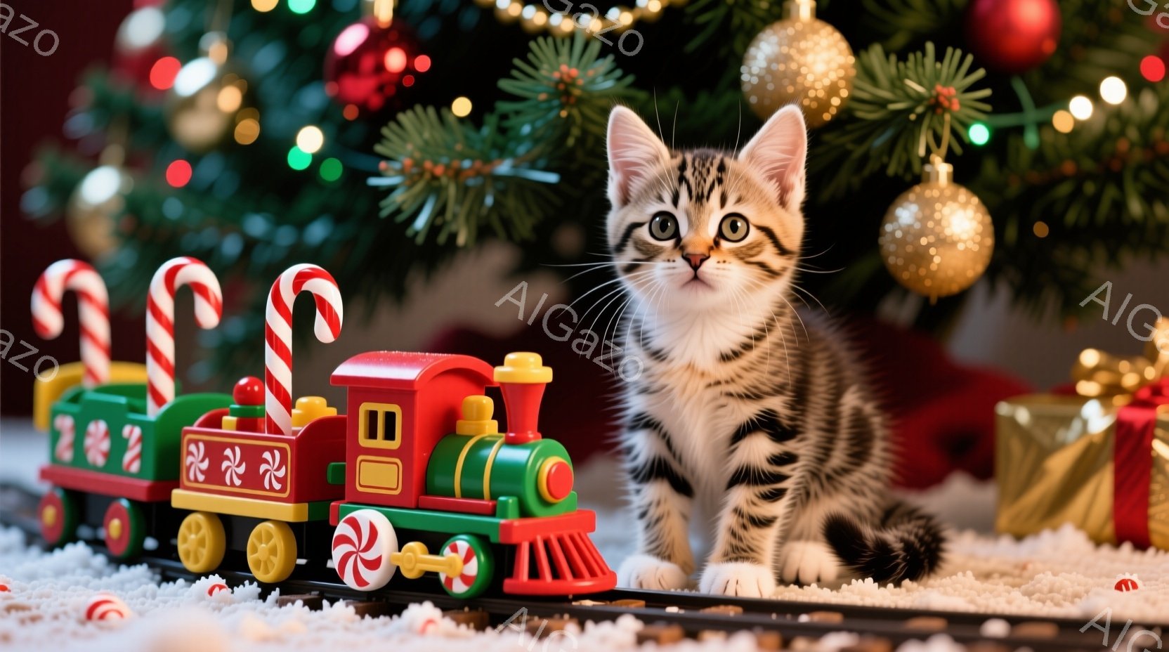 クリスマスツリーのそばに、おもちゃの列車とキャンディケーンに囲まれた縞模様の子猫が座っています。子猫は好奇心旺盛な表情で正面を見つめており、ふわふわとした毛並みが可愛らしいです。背景には緑のクリスマスツリーが飾られ、白い雪のようなものが散りばめられ、温かく楽しいクリスマスの雰囲気が漂っています。