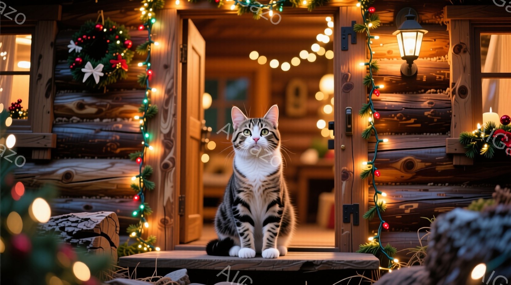 白とグレーの縞模様の猫が、クリスマスの飾り付けがされた丸太小屋の玄関に座っています。猫は正面を見ており、リラックスした表情で、丸太の段差にしっかりと腰掛けています。背景には、点灯したクリスマスライトや装飾が施された小屋があり、温かく穏やかなクリスマスの雰囲気を醸し出しています。