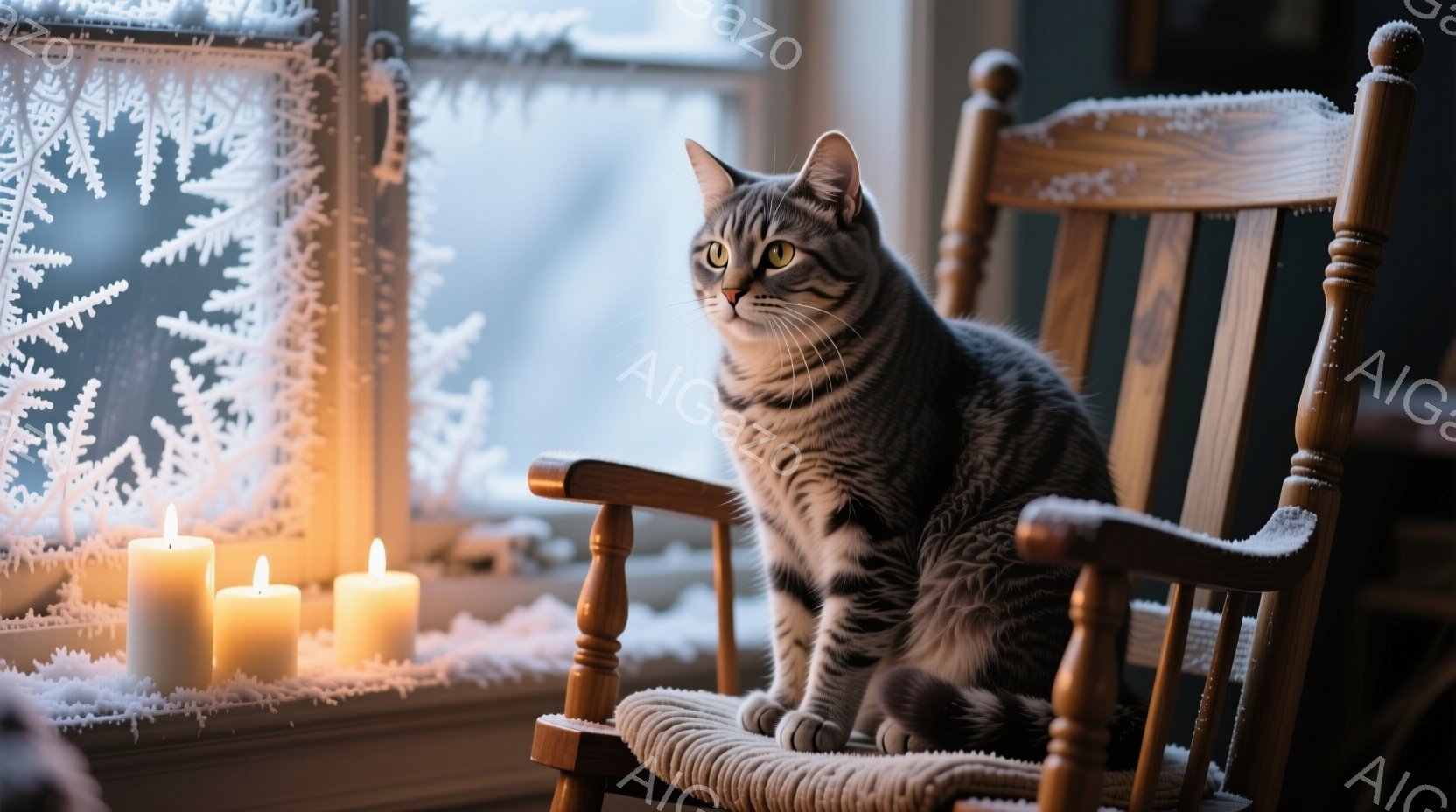 縞模様の猫が、雪の結晶で飾られた窓辺の揺り椅子に座ってこちらを見ている。周囲には灯されたキャンドルが並び、暖かく穏やかな冬の雰囲気を醸し出している。背景はぼやけており、雪景色がうかがえる。