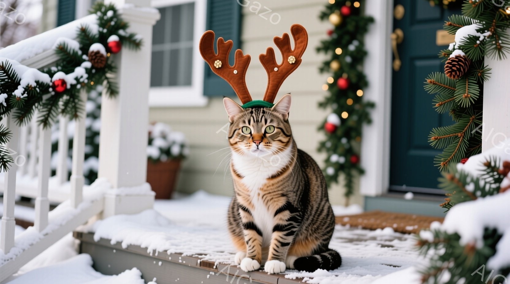 白い足と胸元を持つ、縞模様の猫が雪の降る家の階段に座っています。猫はクリスマス風の角のヘッドバンドをつけており、正面を見て少し驚いたような表情をしています。背景には、クリスマスデコレーションが施された家と雪に覆われた自然が見え、穏やかで可愛らしい冬の雰囲気を醸し出しています。