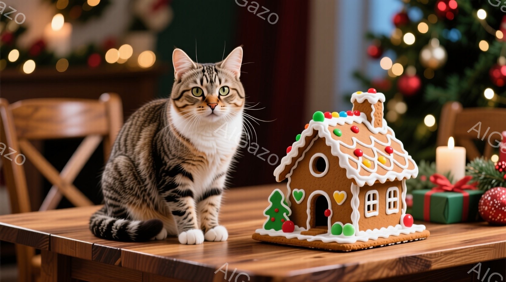 縞模様の猫が木のテーブルの上に座り、正面を見つめています。テーブルの上には、アイシングで飾られたジンジャーブレッドハウスが置かれており、背景にはぼやけたクリスマスツリーと装飾が見えます。全体的に暖かく、お祝いの雰囲気で、猫とジンジャーブレッドハウスがホリデーシーズンを象徴しています。