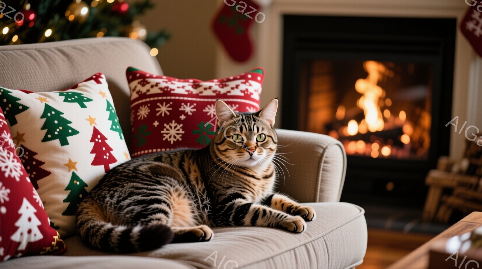 白と茶色の縞模様の猫がベージュ色のソファーに横たわっており、リラックスした表情でカメラを見つめています。背景にはクリスマス柄のクッションが並び、暖炉の炎が暖かく照らしています。全体的に、冬の温かく心地よい雰囲気が漂う、家庭的な光景です。