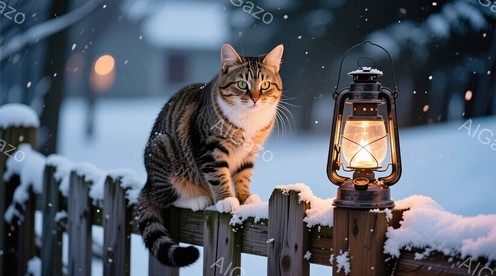 雪が降る夜、柵の上に座っている縞模様の猫が写っています。猫は鋭い眼差しで何かを見つめており、その姿勢は警戒心と好奇心を同時に表しています。背景にはぼんやりと家が見え、暖かく光るランタンが雪景色に温かみを加えています。
