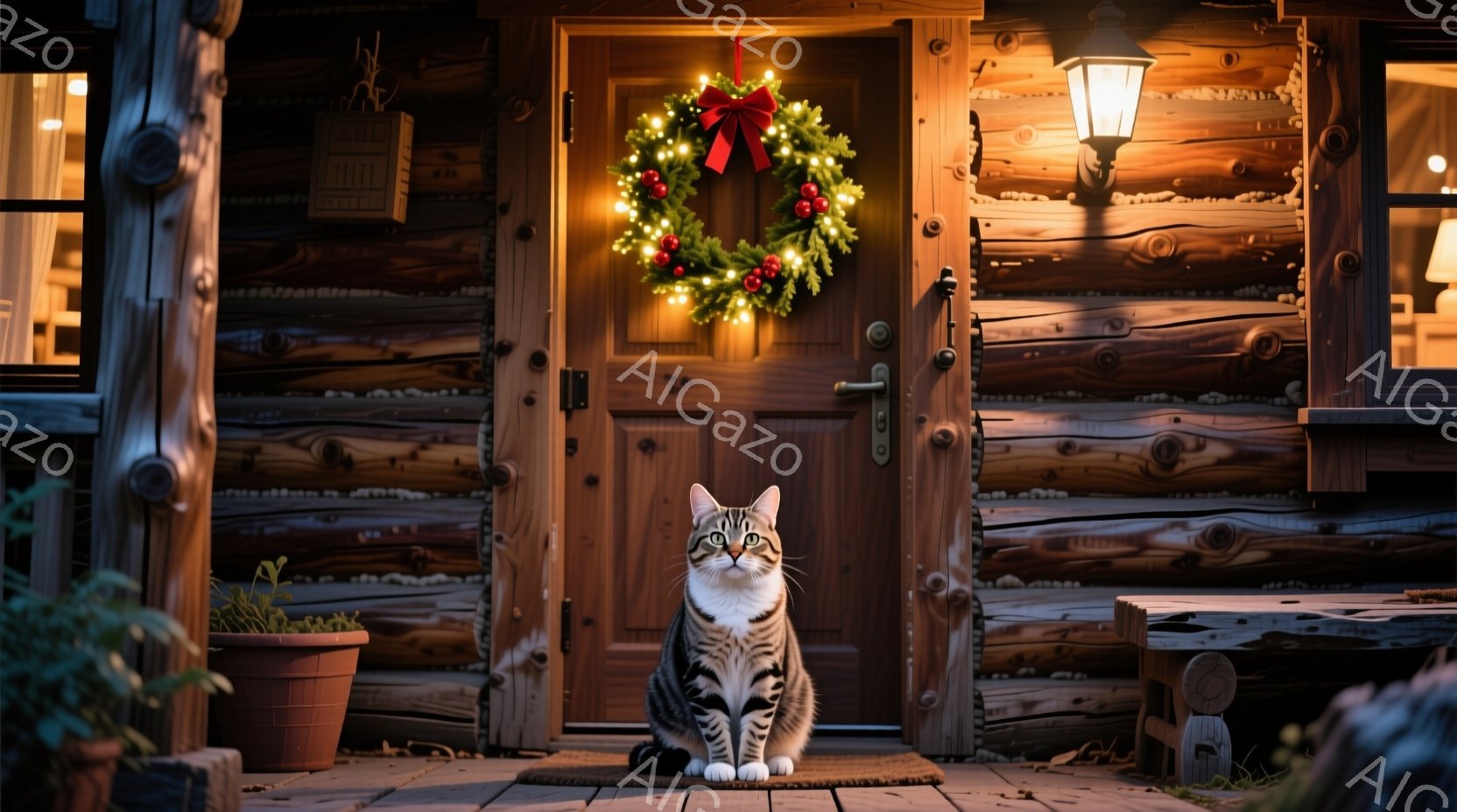 ログハウスの玄関先に、縞模様の猫が正面を向いて座っている。背景にはクリスマスらしい飾り付けが施された玄関ドアや、植物が置かれた小さなテーブルが見え、暖かく穏やかな雰囲気が漂う。暖色の照明が猫と玄関を照らし、冬の夜の静けさと安らぎを表現している。