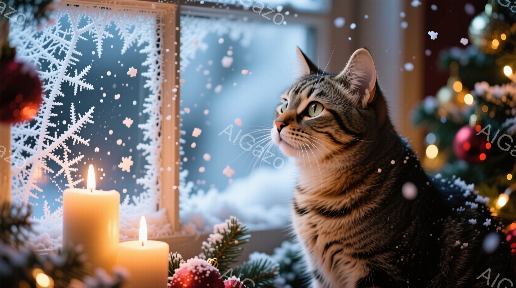 縞模様の猫が窓の外を見つめており、背景には雪が舞い散る冬景色が見える。窓辺には点灯したキャンドルが置かれ、クリスマスツリーの飾りと雪の結晶模様が暖かく優しい雰囲気を醸し出している。猫の目は優しく、冬の静寂と暖炉の光が組み合わさり、穏やかな季節の情景を描いている。