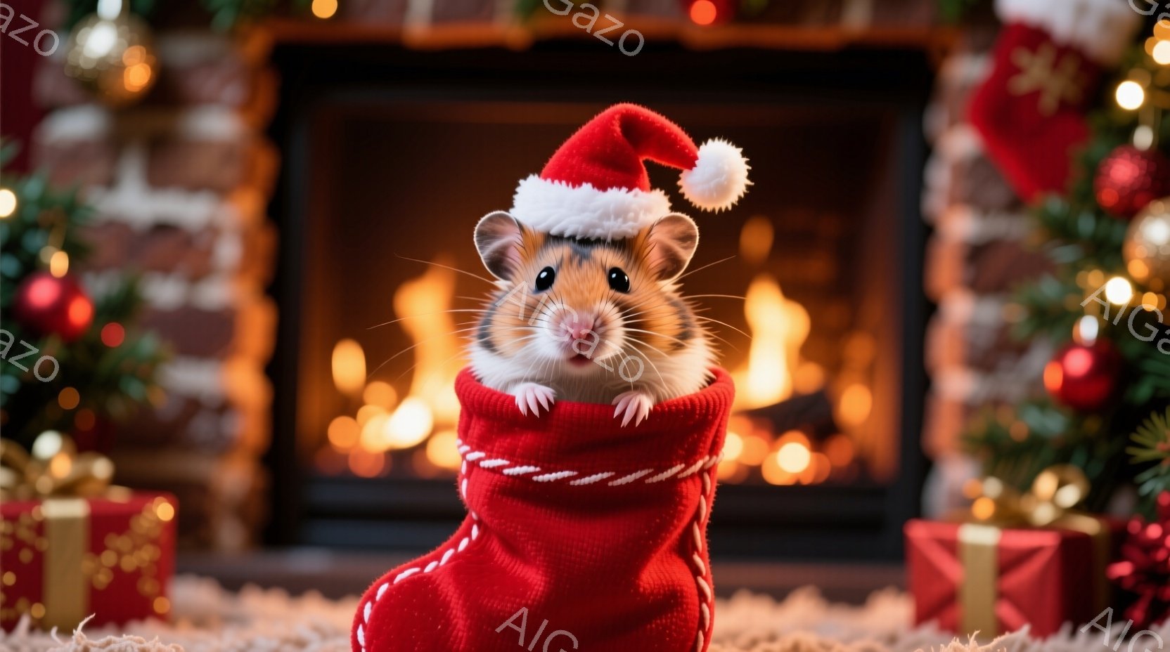 小さなハムスターが、赤いクリスマスソックスの中に体を入れ、少し顔を出しています。ハムスターは小さなサンタの帽子をかぶり、可愛らしい表情でこちらを見ています。背景には暖炉の炎と、クリスマスツリーの飾り、プレゼントボックスが見え、温かく幸せなクリスマスの雰囲気が漂っています。