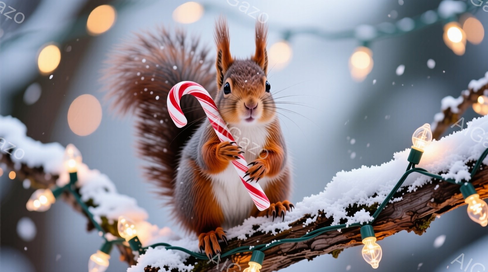 赤褐色のリスが、雪に覆われた木の枝にしがみつき、ピンクと白のキャンディケーンを前足で抱えています。リスの毛並みはふっくらとしており、黒々とした目が好奇心旺盛に輝いています。背景にはぼやけた雪景色と、キラキラと輝く電飾が飾られた枝が広がり、冬の暖かい雰囲気を演出しています。
