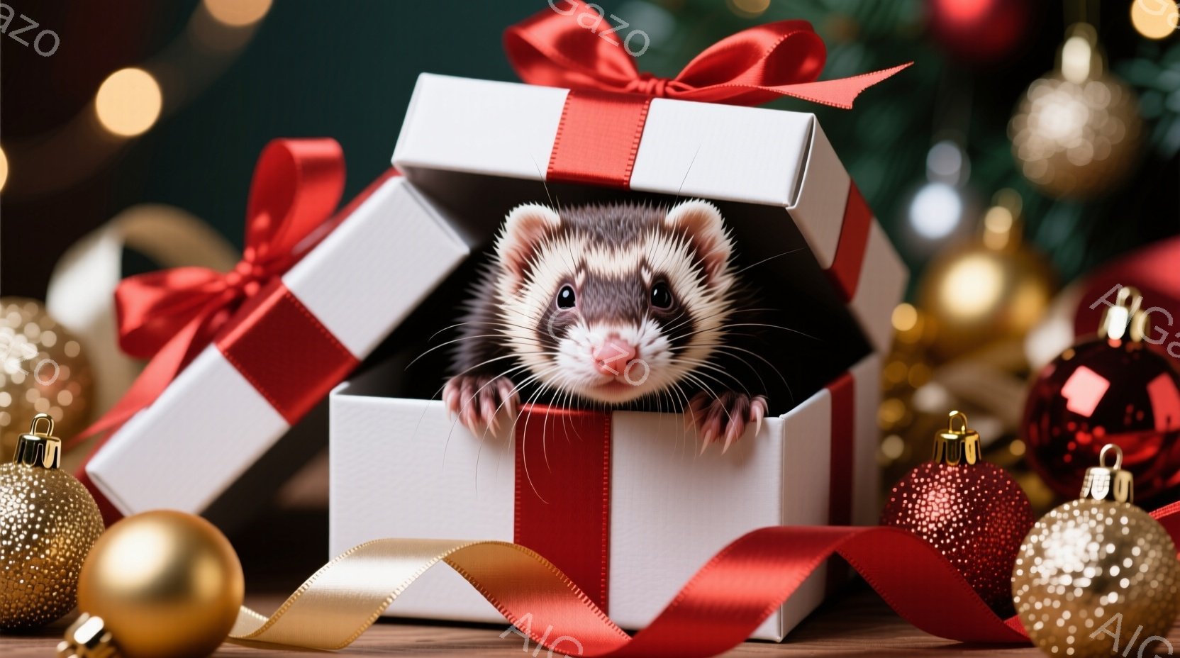 白いギフトボックスから顔を出し、好奇心いっぱいの表情でこちらを見つめるフェレットが写っています。赤いリボンが箱を飾り、背景には赤や金、青のクリスマスオーナメントが散りばめられて、華やかな祝祭の雰囲気を醸し出しています。全体的に温かく、遊び心に満ちた印象を与える写真です。