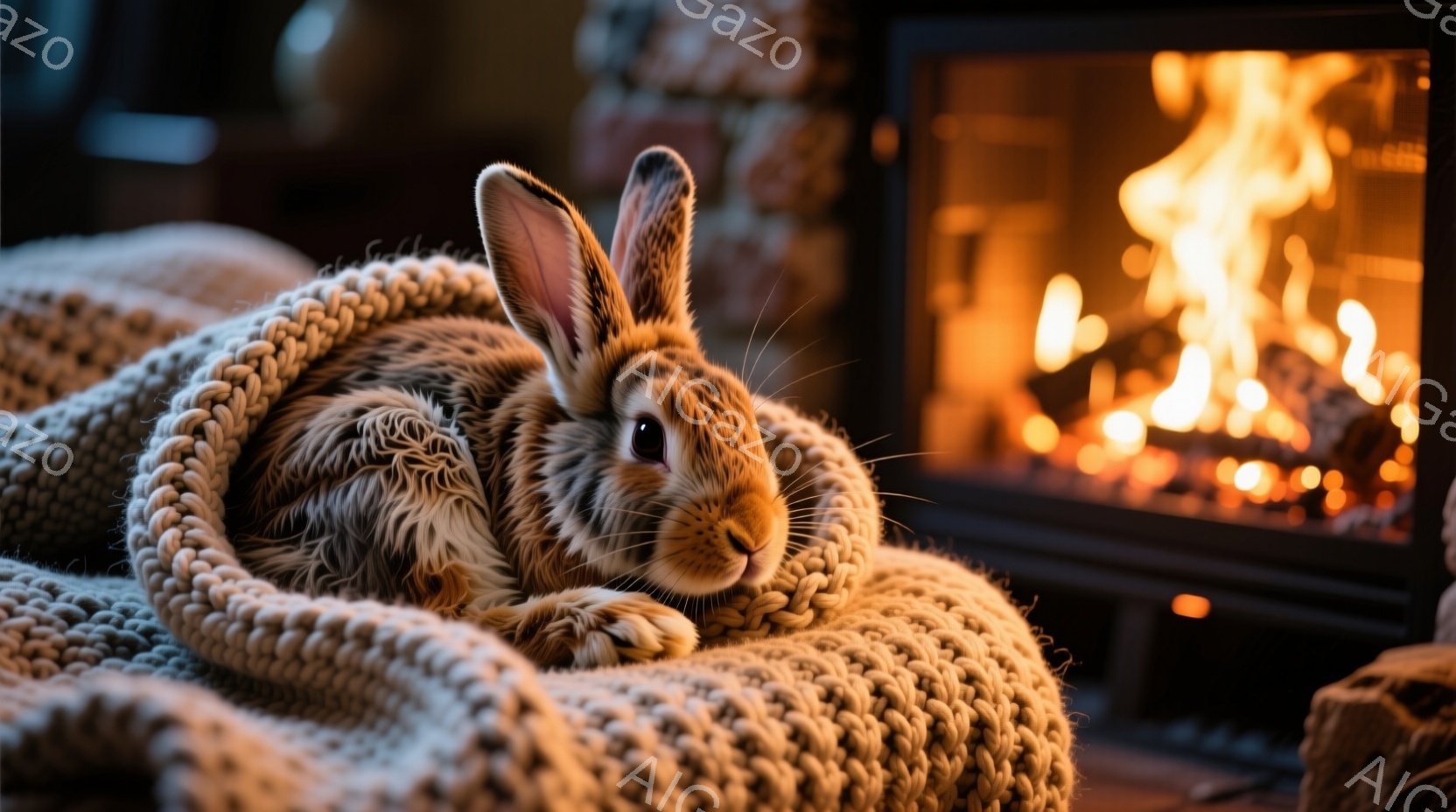 暖炉のそばで、クリーム色の編み物で包まれた茶色のウサギがリラックスして横たわっています。ウサギは正面を見つめ、少し警戒した表情をしています。背景には燃え盛る暖炉があり、部屋全体を暖かく照らしています。