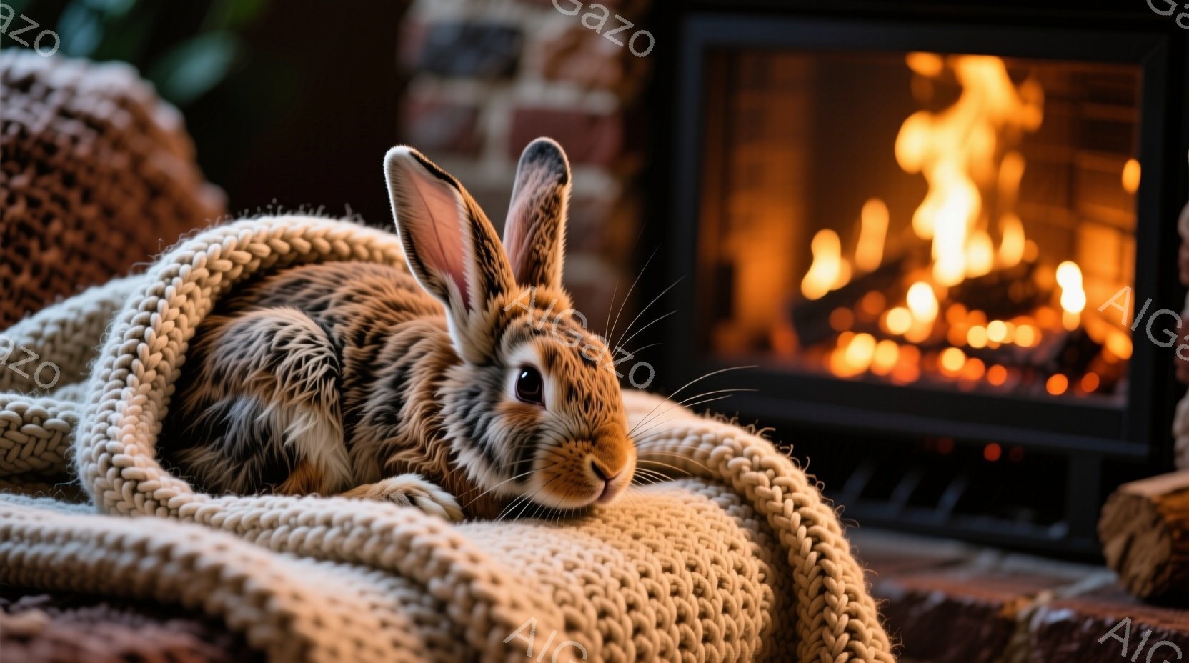 暖炉のそばで、毛織りの大きな編み物のバスケットに座っている茶色のウサギが写っています。ウサギはリラックスした様子で、前足を組んで、穏やかな表情でこちらを見ています。暖炉の火が暖かく照らし、背景にはぼやけた部屋の一部が見え、温かく心地よい雰囲気を作り出しています。