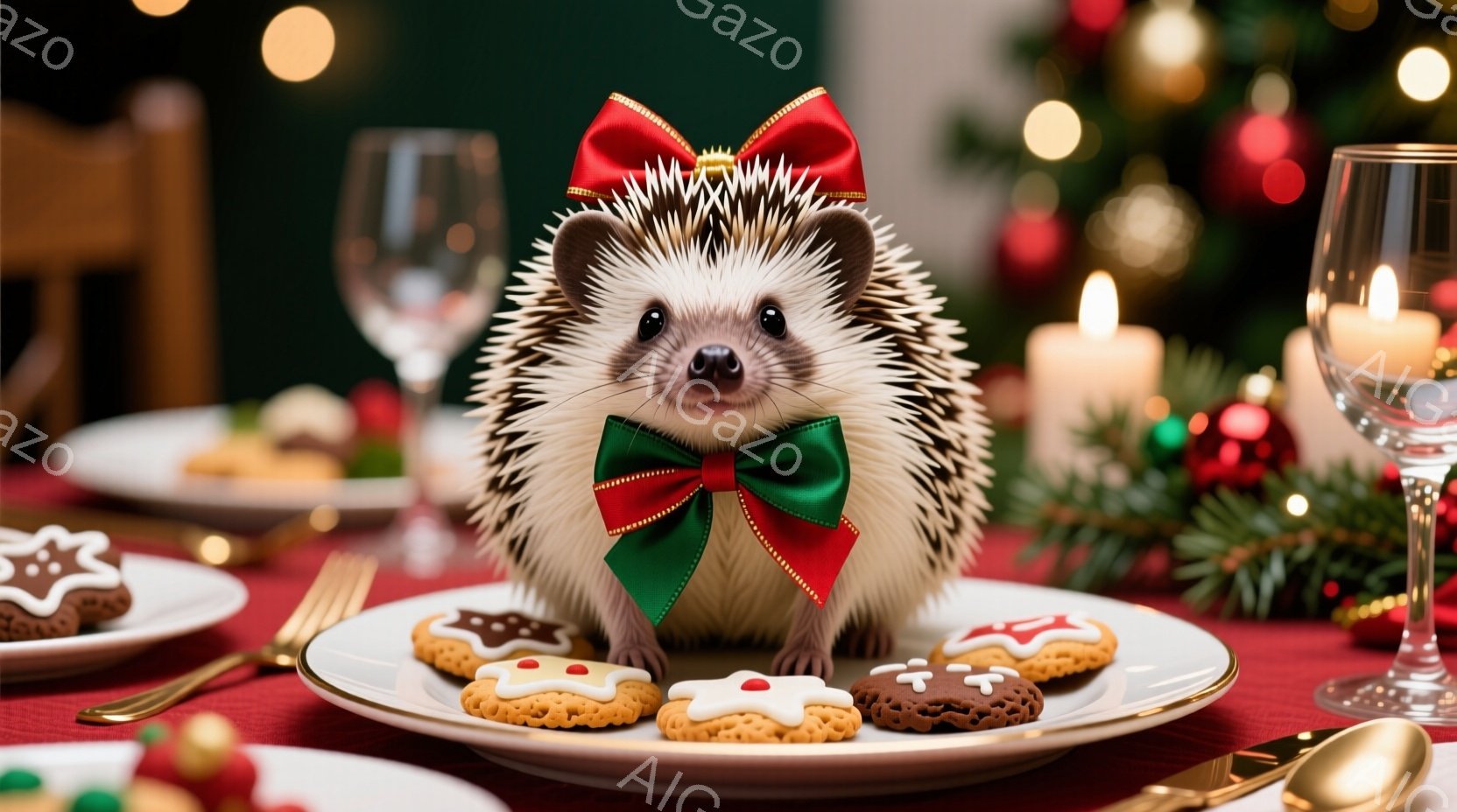 クリスマスらしい赤いテーブルクロスの上に、緑色のリボンを付けた可愛らしいハリネズミが座っています。ハリネズミはクッキーが並んだ皿の中央に位置し、少し上目遣いでカメラを見ており、愛らしい表情をしています。背景には、ぼやけたクリスマスツリーの光や他の食器が見え、温かくお祝いムードに満ちた雰囲気が漂っています。