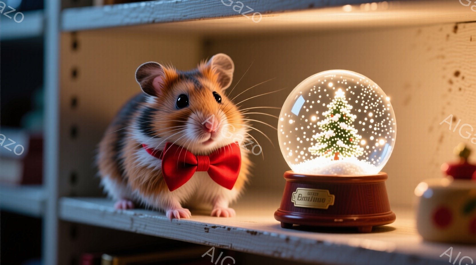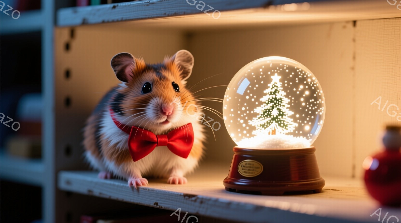 白と茶色の毛並みを持つハムスターが赤い蝶ネクタイを着用し、棚の上で前足を組んで立っています。背景には、雪の結晶が舞うクリスマスツリーが収められたガラスの雪球と、暖色系の装飾品が見え、全体的に温かく、お祝いの雰囲気を醸し出しています。ハムスターは少し微笑んでいるように見え、可愛らしさと遊び心に満ちた表情をしています。