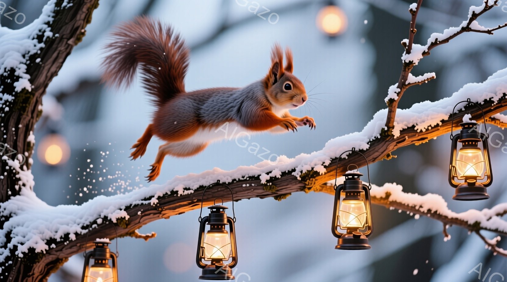 白い雪で覆われた木の枝の上で、リスが躍動的なジャンプをしています。周囲には、温かい光を放つ古いランタンが吊るされ、雪景色の中に幻想的な雰囲気を添えています。背景はぼやけていますが、暗い森と雪が降る夜空が感じられ、静かで穏やかな冬の情景が広がっています。