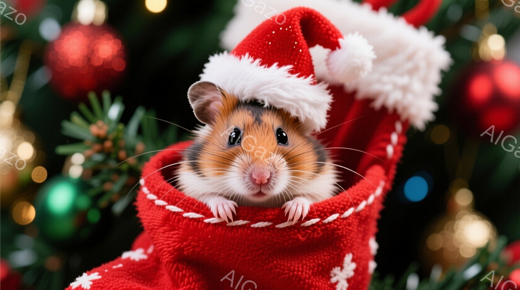 赤いクリスマスストッキングの中に、可愛らしいハムスターがちょこんと座っています。ハムスターは小さなサンタ帽を被り、つぶらな瞳でこちらを見つめており、無邪気な表情が印象的です。背景にはぼやけたクリスマスツリーの飾りが見え、暖かく幸せな雰囲気が漂っています。