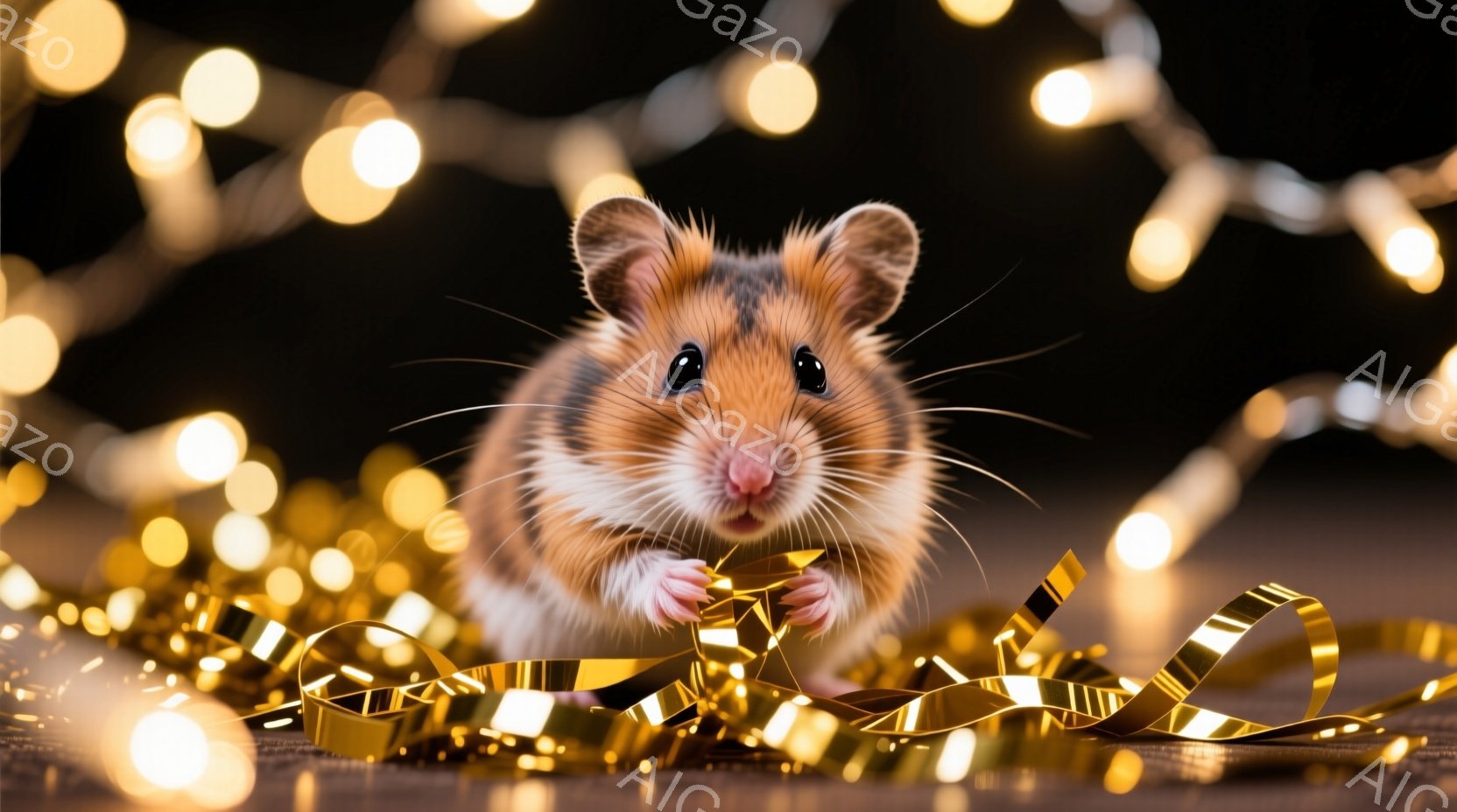 小さなハムスターがキラキラとした金色のリボンに囲まれて座っています。ハムスターは茶色と白の毛並みで、つぶらな瞳と小さな鼻が可愛らしい表情を見せています。背景にはぼやけた金色の光が散りばめられており、お祝いムードを演出しています。