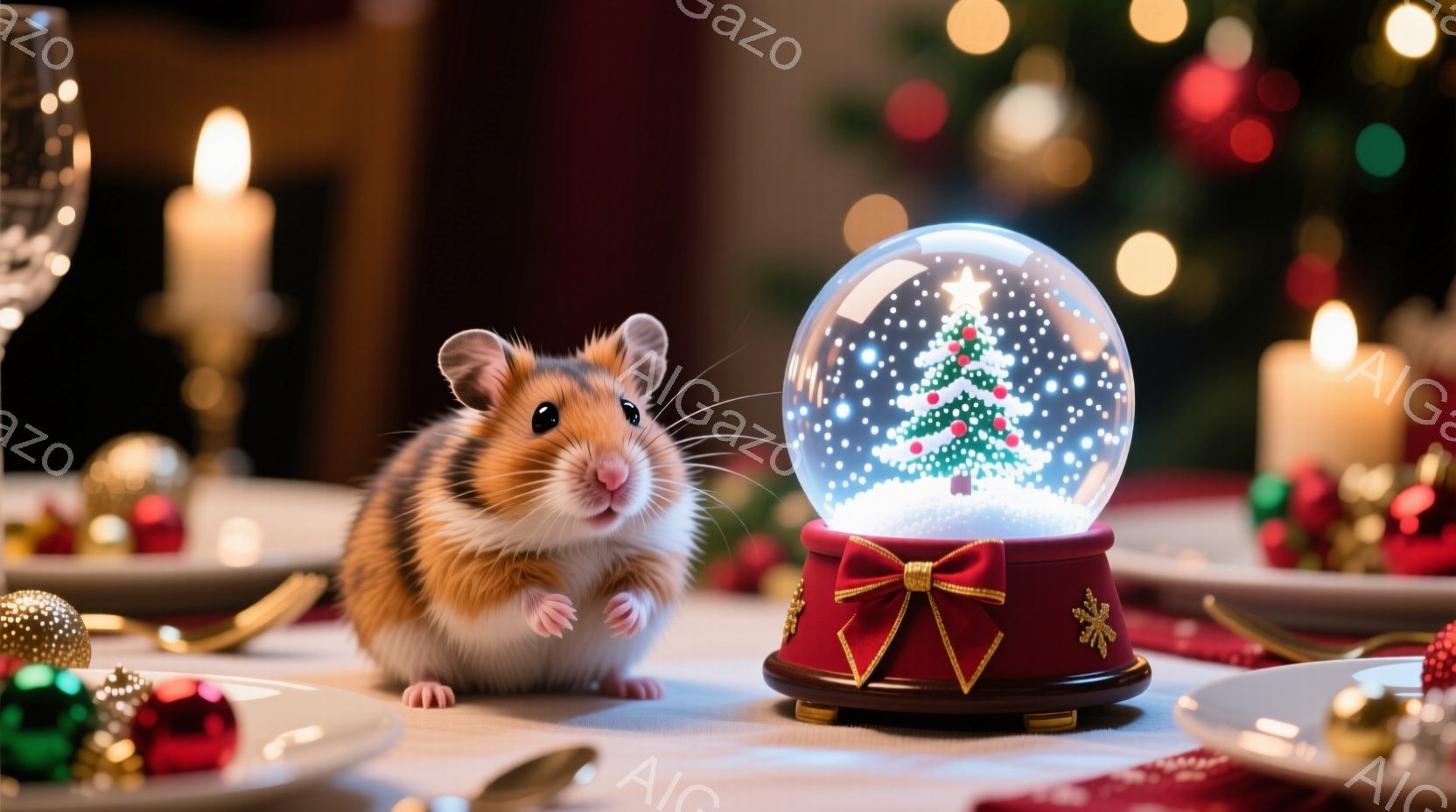 ハムスターがテーブルの上に立っており、正面を見据えています。背景には、雪が降るクリスマスの飾り付けとぼんやりとしたキャンドルの光があり、暖かくお祝いムードを醸し出しています。クリスマスの雪の玉がハムスターの隣に置かれ、全体的にクリスマスの雰囲気が漂っています。