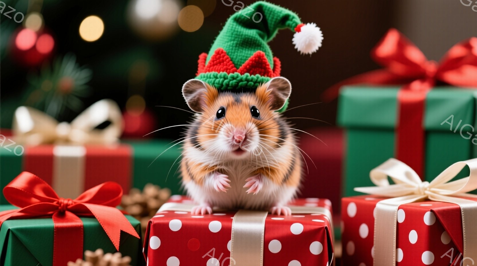 小さなハムスターが、クリスマス柄のプレゼント箱の上に立っており、頭には赤い帽子をかぶっています。ハムスターは正面を見ており、少し微笑んでいるような表情をしています。背景にはぼやけたクリスマスツリーや、他のプレゼント箱が写っており、全体的に温かく、お祝いの雰囲気が漂っています。