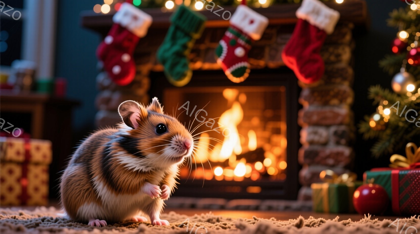 ハムスターがカーペットの上に座り、前足を少し上げて何かを見つめている。背景には暖炉があり、火が燃え、クリスマスソックスが暖炉の上に飾られている。暖炉の周りには植物や家具があり、温かく、居心地の良いクリスマスの雰囲気が漂っている。
