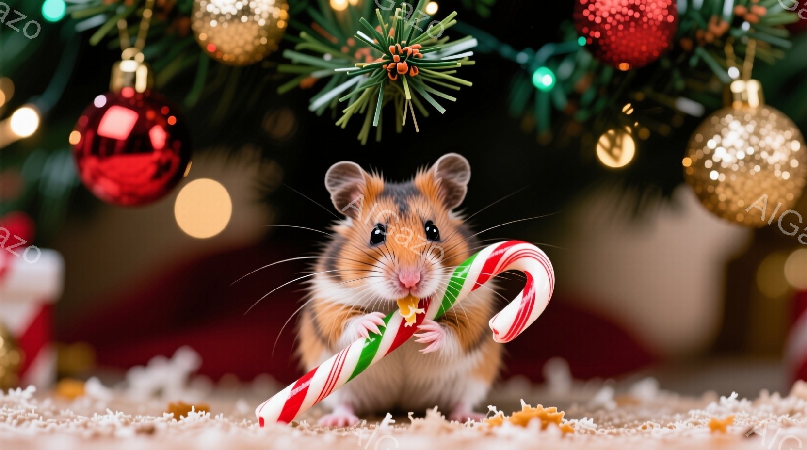 この無料AI生成画像「赤と緑のクリスマス柄の靴下の中から、小さなハムスターが顔を出しています。ハムスターは好奇心旺盛な表情で、少し不安げにこちらを見ています。背景は石造りの壁で、暖炉の一部であると思われます。」は、2025年10月25日に作成されました。 サイズは 1664×928px の高解像度で、商用利用も可能なフリー素材として提供しています。