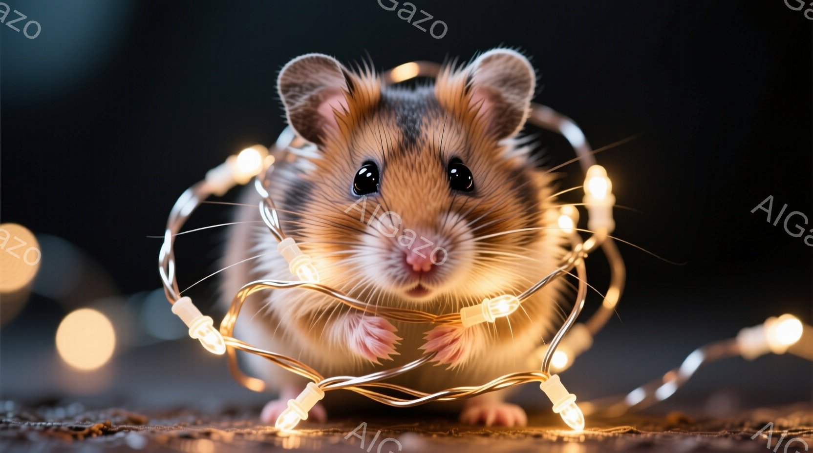 小さなハムスターが、キラキラと光る電飾に囲まれて座っています。ハムスターは前足を伸ばし、少し上目遣いでカメラを見ており、可愛らしい表情をしています。背景は暗く、電飾の光がハムスターを照らし出し、温かく幻想的な雰囲気を醸し出しています。