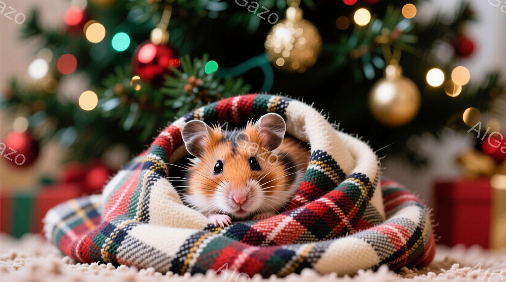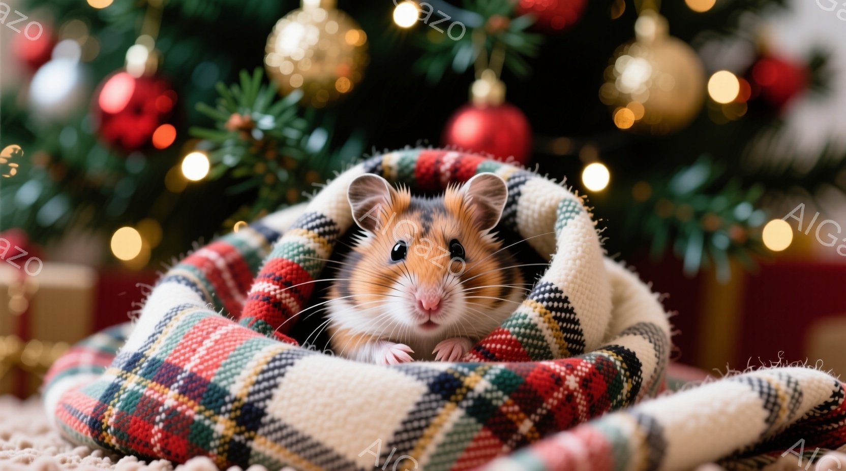 ハムスターが赤と緑のチェック柄の布に包まれ、可愛らしく前を見つめている。背景にはクリスマスツリーの緑と飾り、そしてギフトボックスが見え、暖かくお祝いムードに満ちている。全体的に温かみのある、愛らしい雰囲気が漂う。