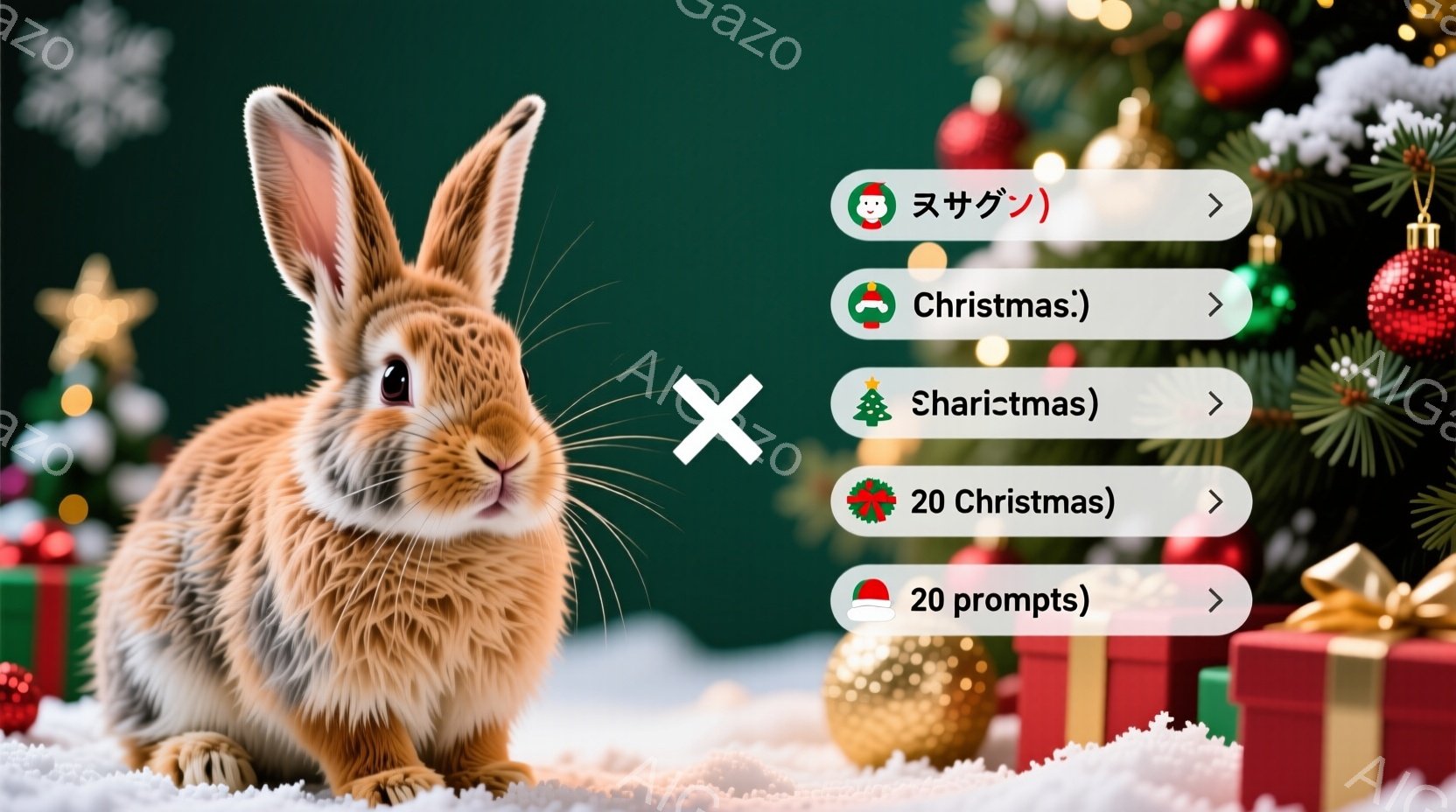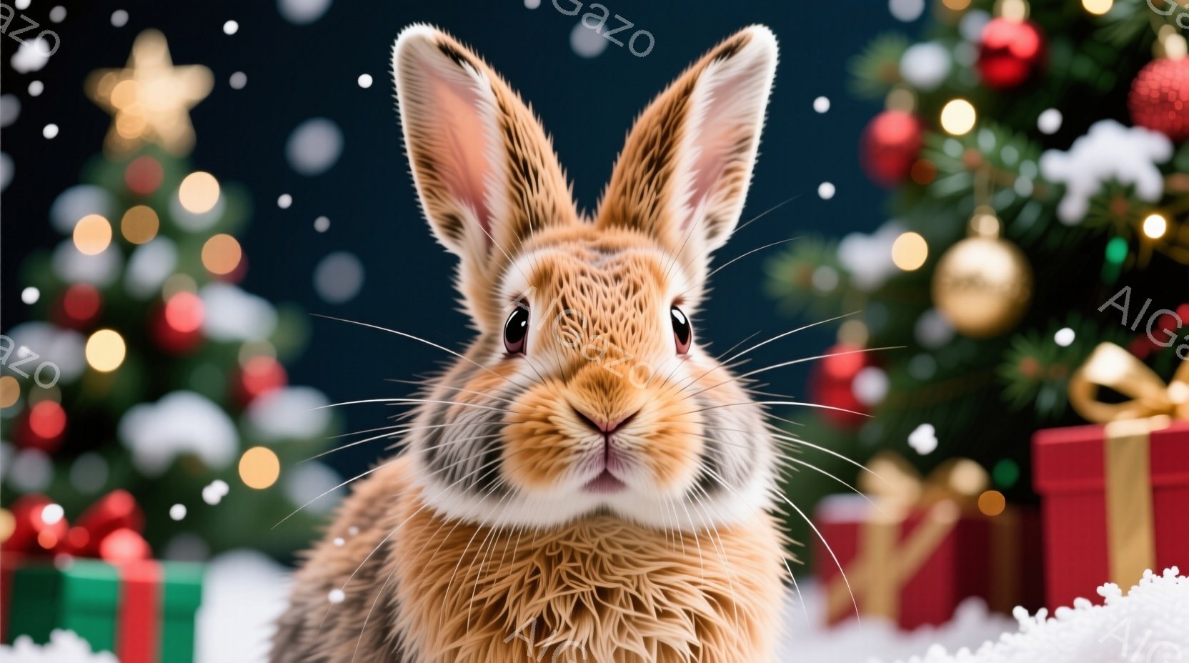 赤いリボンを首に巻いた可愛らしいウサギが描かれています。ウサギは雪の上に座り、クリスマスのプレゼントに囲まれています。背景には、キラキラと輝くクリスマスツリーのオーナメントや雪が舞っており、暖かくお祝いムードに満ちた雰囲気です。