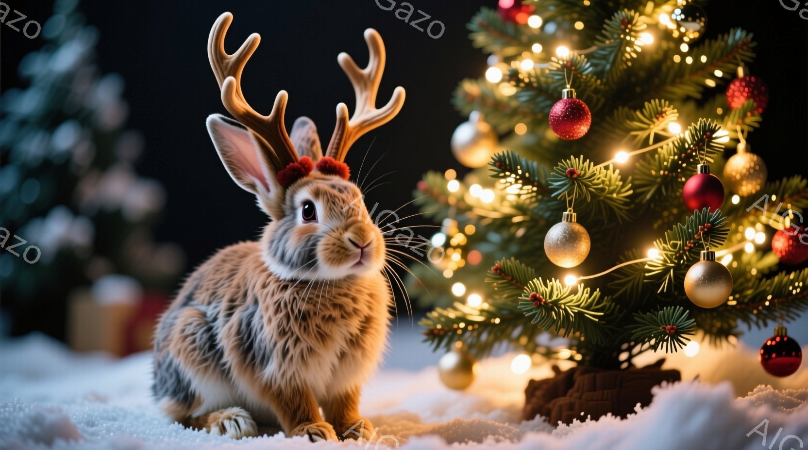 明るい茶色の毛並みのウサギが、雪景色の中で正面を向いて座っています。背景には、輝くオーナメントで飾られたクリスマスツリーと、赤いプレゼントボックスが置かれた雪原が広がっています。全体的に暖かく、お祝いムードにあふれた、冬の可愛らしい雰囲気です。