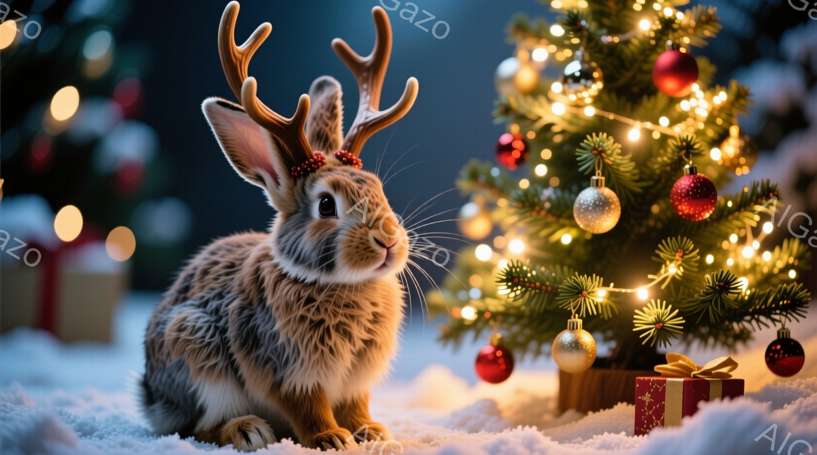 この無料AI生成画像「白い雪が降り積もる家の外階段に、赤色の毛皮のケープを羽織った茶色のウサギが座っています。ウサギは前足を揃えて座り、少し上目遣いで見つめており、愛らしい表情をしています。背景には雪で覆われた家の外観があり、クリスマスの飾り付けが施された植木鉢も見えます。」は、2025年10月25日に作成されました。 サイズは 1664×928px の高解像度で、商用利用も可能なフリー素材として提供しています。