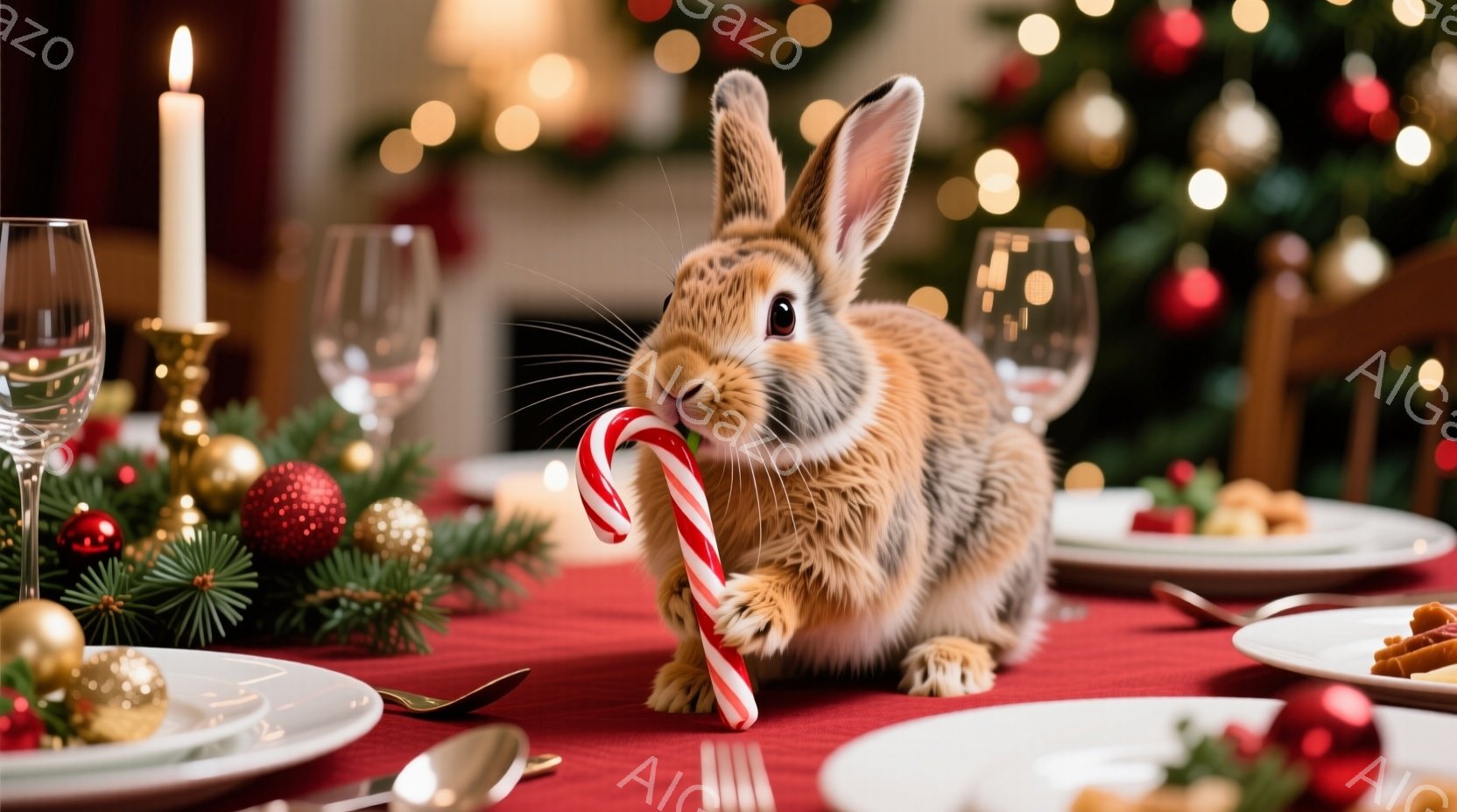 暖炉とクリスマスツリーがぼんやりと見えるダイニングテーブルの真ん中に、茶色のウサギが立っています。ウサギは口に赤と白のキャンディケーンを持っており、前足で食器を支えようとしているような姿勢です。テーブルには、食器、キャンドル、そして少しの食べ物が置かれており、温かく、お祝いムードの漂うクリスマスの光景が描かれています。
