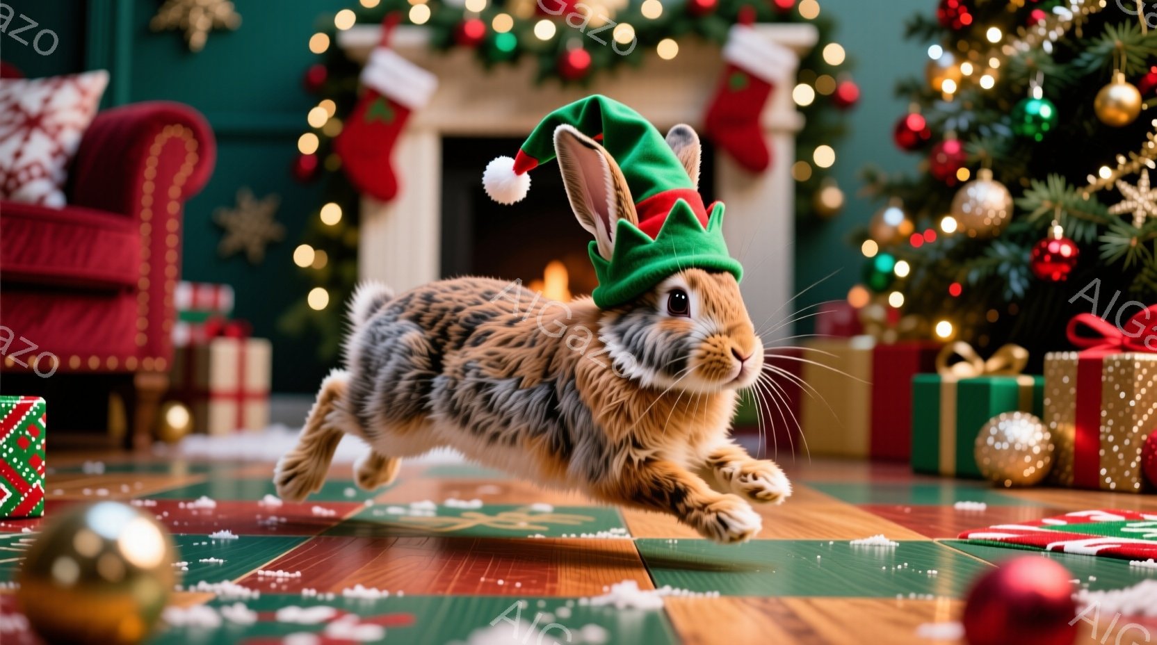 暖炉のそばの床で、クリスマスの帽子をかぶった茶色のウサギが飛び跳ねています。背景には、装飾されたクリスマスツリーと、様々なラッピングされたプレゼントが置かれ、暖かい祝祭の雰囲気が漂っています。ウサギは活発で楽しそうに、クリスマスの喜びを表現しています。