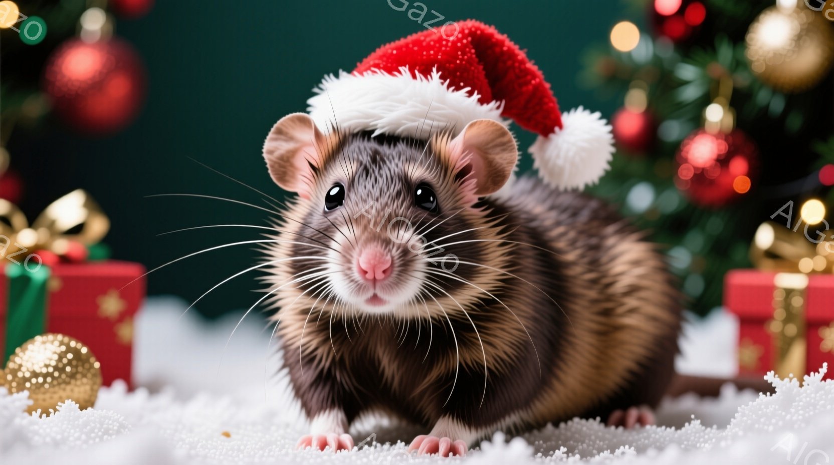 イタチの姿をした動物が、頭に赤いサンタ帽をかぶって雪の上に座っています。その表情は穏やかで、つぶらな瞳がこちらを見つめており、愛らしい印象を与えます。背景にはクリスマスツリーやプレゼントがぼやけて写っており、暖かくお祝いムードに包まれた様子が伝わってきます。