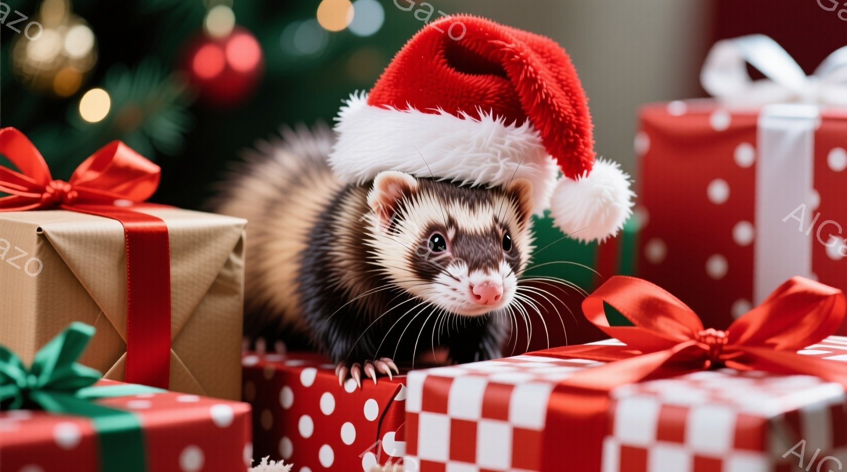イタチがクリスマスプレゼントの山の中で座っています。赤いサンタ帽をかぶり、興味津々とした表情で前を見つめています。背景にはぼやけたクリスマスツリーと装飾が見え、お祝いムードを醸し出しています。