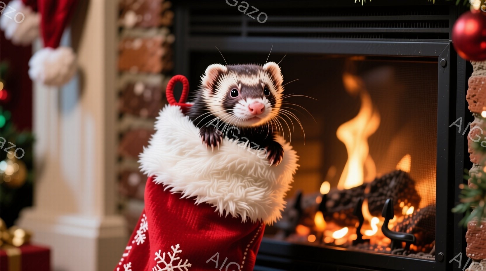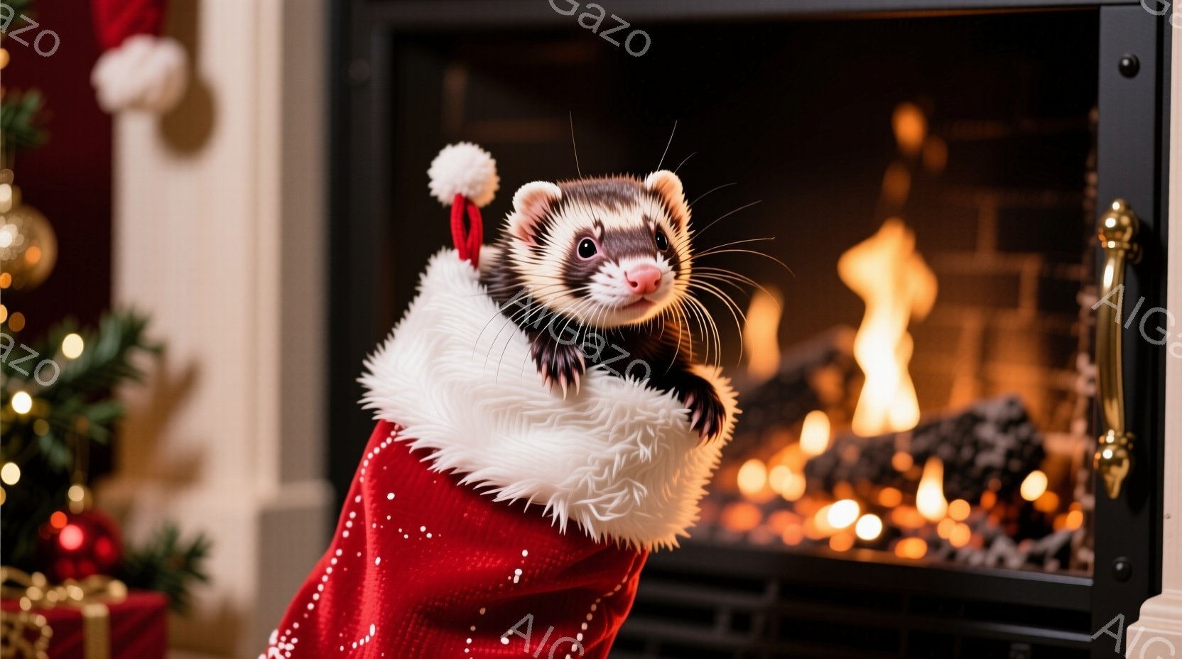 赤いクリスマスストッキングの中に、毛並みの美しいフェレットが顔を出しています。フェレットは少し不安げな表情で、好奇心旺盛な眼差しでこちらを見ています。背景には暖炉の炎とクリスマスツリーの緑が映り、温かく穏やかなクリスマスの雰囲気が漂っています。