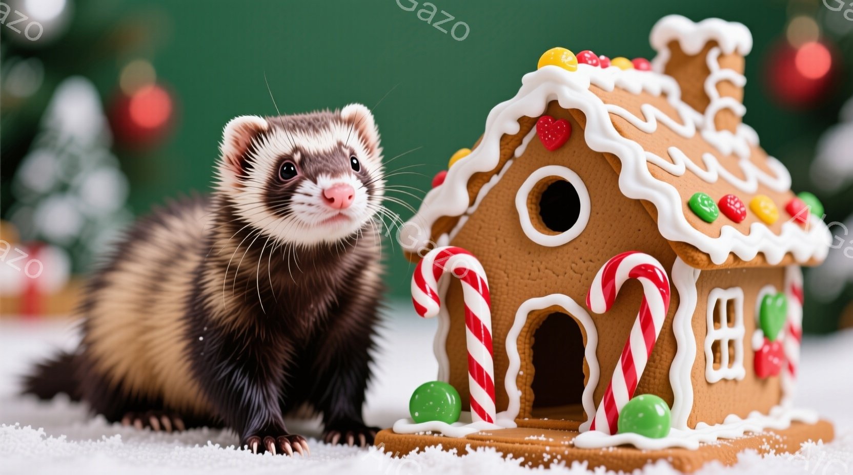 鮮やかなターコイズブルーの背景に、雪景色が広がっています。茶色のイタチが、キャンディケーンとグミで飾られたジンジャーブレッドハウスの前に立っており、好奇心旺盛な表情でこちらを見ています。全体的に、暖かく、お祝いの雰囲気で、冬のホリデーシーズンを連想させる画像です。