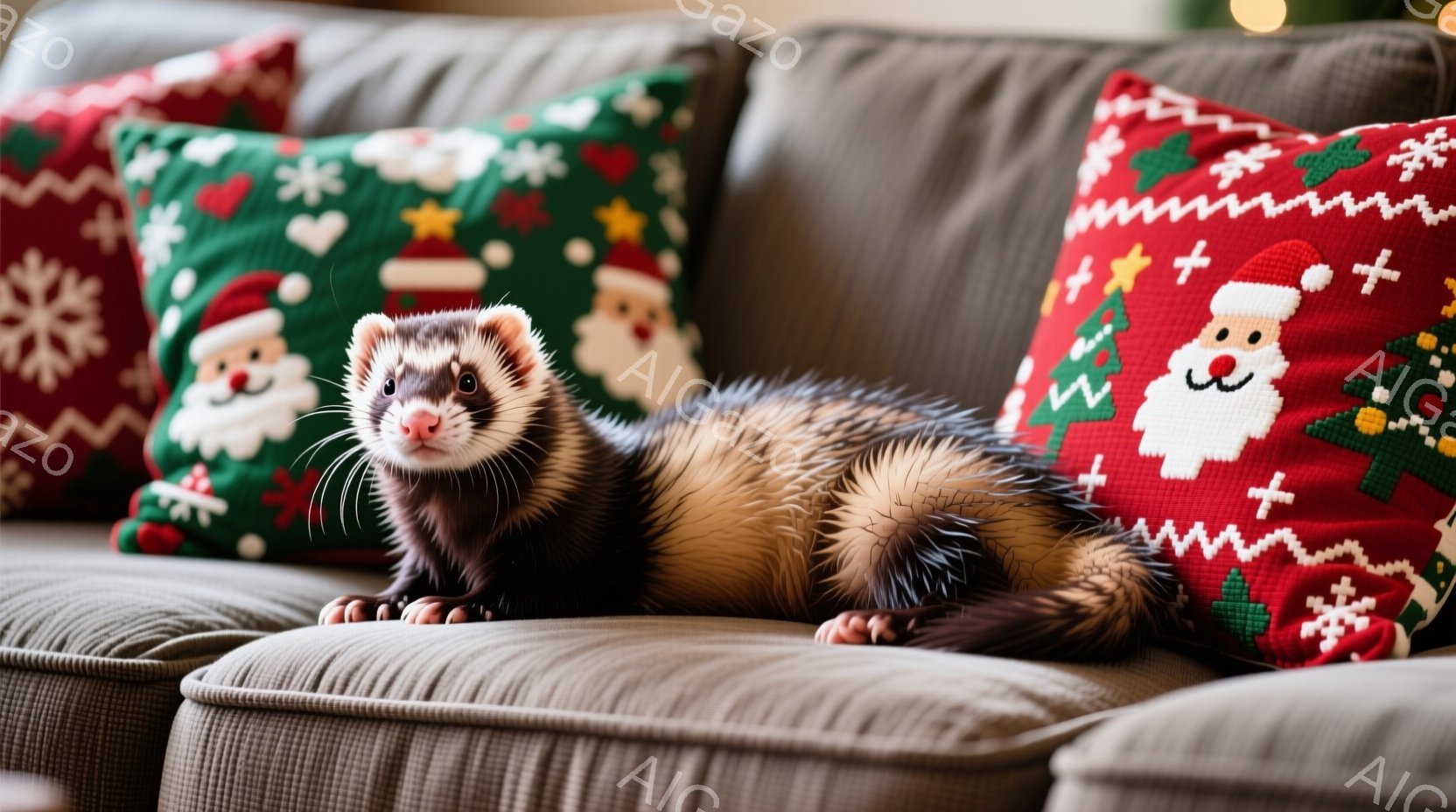 白と茶色のフェレットが、クリスマス柄のクッションが置かれたベージュ色のソファに横たわっています。フェレットはリラックスした様子で、カメラに向かってわずかに微笑んでいるように見えます。背景にはぼやけたクリスマスツリーの光が見え、温かく、お祝いムードの漂う雰囲気です。