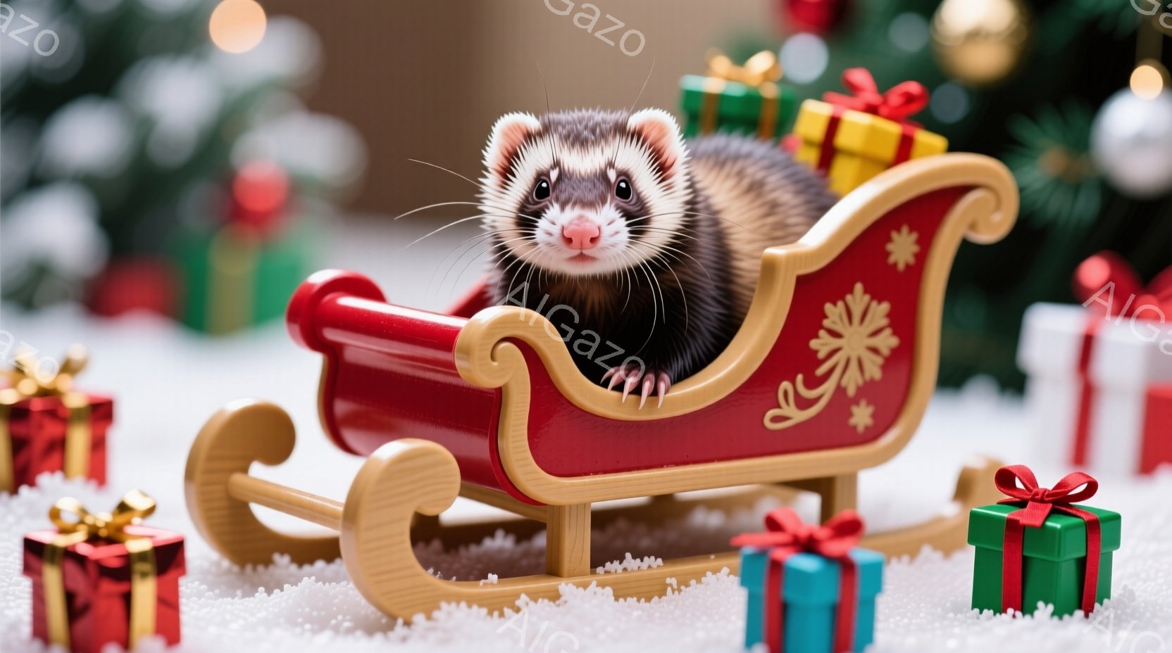 赤いそりに乗った可愛らしいフェレットが写っています。フェレットは前足をそりの縁にかけ、好奇心旺盛な表情で正面を見ています。背景には、雪景色の中にクリスマスツリーやプレゼント箱が散りばめられ、温かく幻想的な雰囲気を醸し出しています。