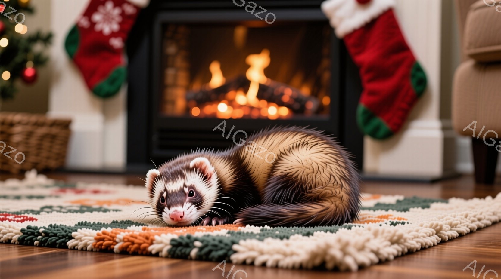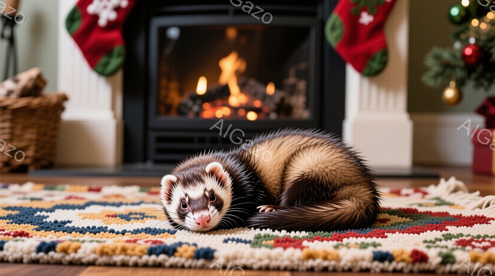 暖炉のそばの絨毯に、茶色と白のフェレットがうずくまっている。背景には、クリスマスツリーとプレゼントの箱、そして赤い靴下が見え、冬の暖かく祝祭的な雰囲気が漂っている。フェレットはリラックスした様子で、穏やかな表情を浮かべている。