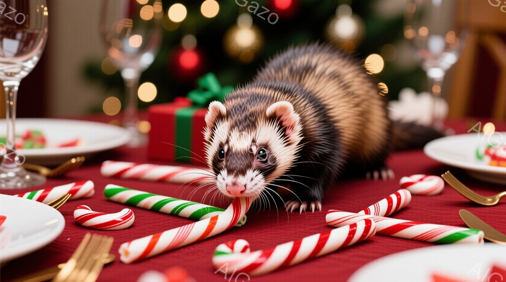 緑色のテーブルクロスの上に、キャンディケーンが散らばっており、その中にイタチが鼻を突っ込んでキャンディケーンを調べている様子が写っている。背景には食器や装飾がぼやけており、クリスマスの雰囲気を感じさせる暖かい光が灯っている。イタチの毛並みは美しく、好奇心旺盛な表情が印象的である。