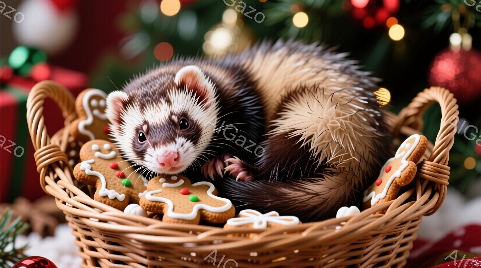 雪が積もった屋根の上にイタチが立っており、鮮やかなクリスマスライトが屋根を飾り付けている。イタチは前方をまっすぐ見つめ、毛並みが美しく、冬の寒さの中、凛とした姿を見せている。背景には、雪に覆われた建物やクリスマスツリーがぼやけ、冬の暖かく、幻想的な雰囲気を醸し出している。