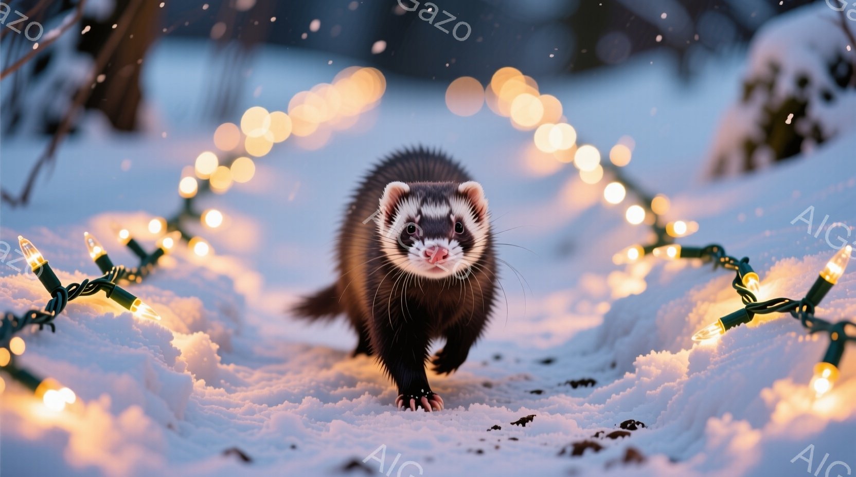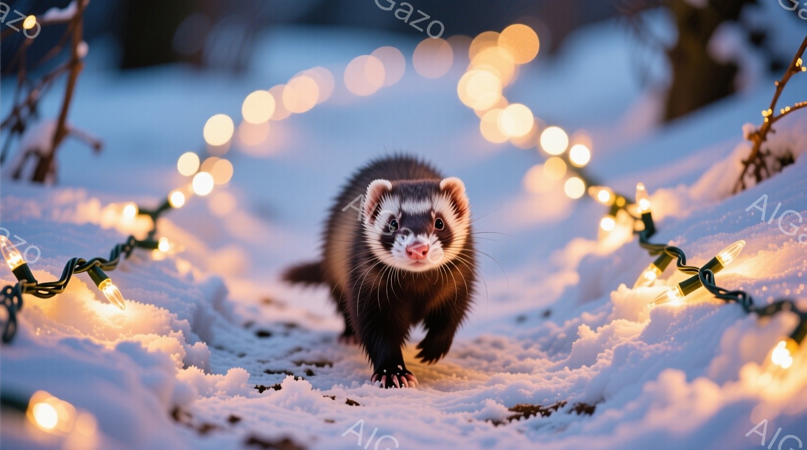 白い雪の上に、毛皮の動物、イタチが正面を向いて歩いている。周囲にはクリスマスのイルミネーションが散りばめられており、冬の静けさの中に温かい光が広がっている。イタチは黒い毛並みで、小さな鼻が可愛らしく、どこか好奇心旺盛な表情をしている。