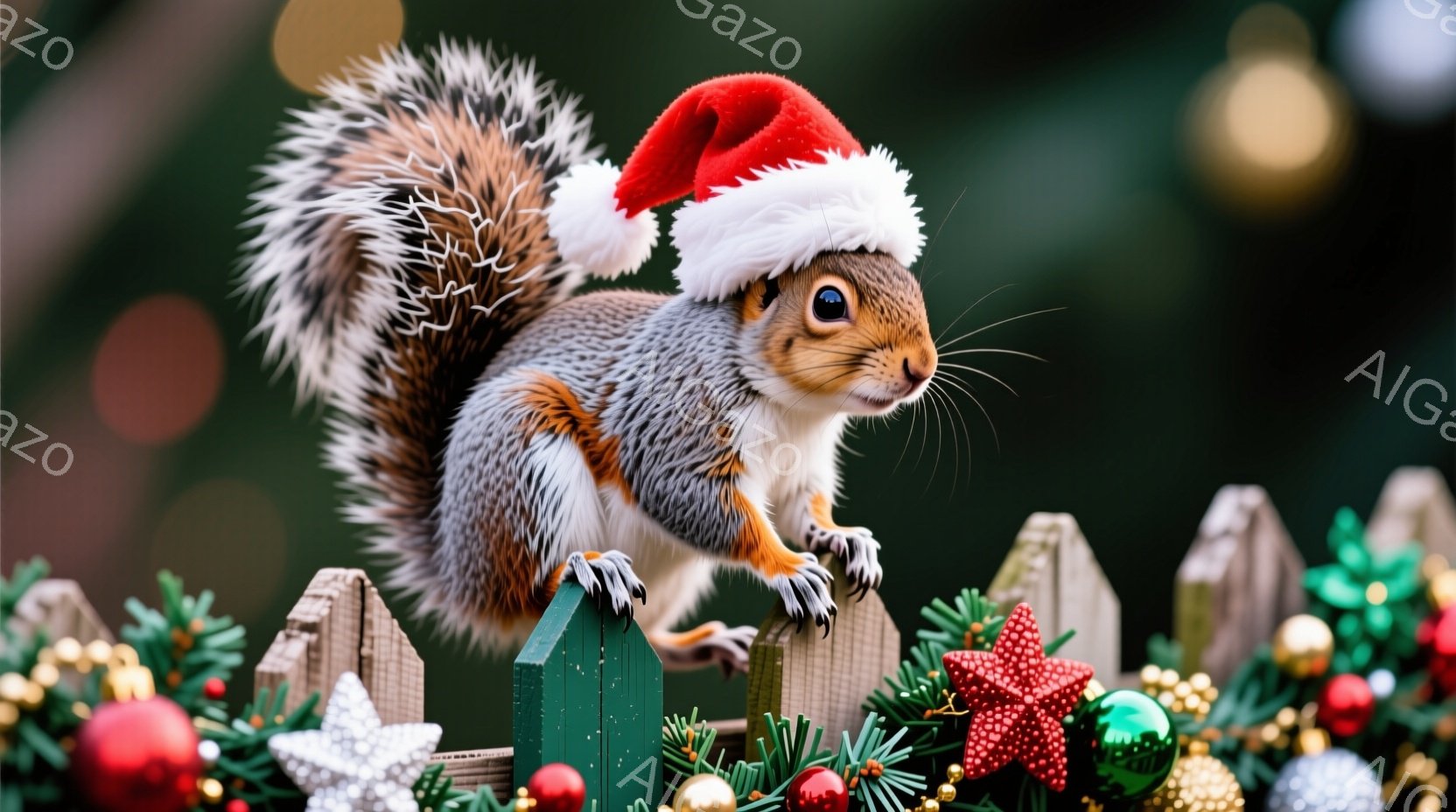 リスがクリスマスの帽子をかぶり、緑色の柵の上で前足を上げて立っている。背景には、クリスマス飾りで飾られたフェンスと、雪が舞うぼやけた自然が見える。全体的に、冬の暖かくお祝いの雰囲気を感じさせる画像である。