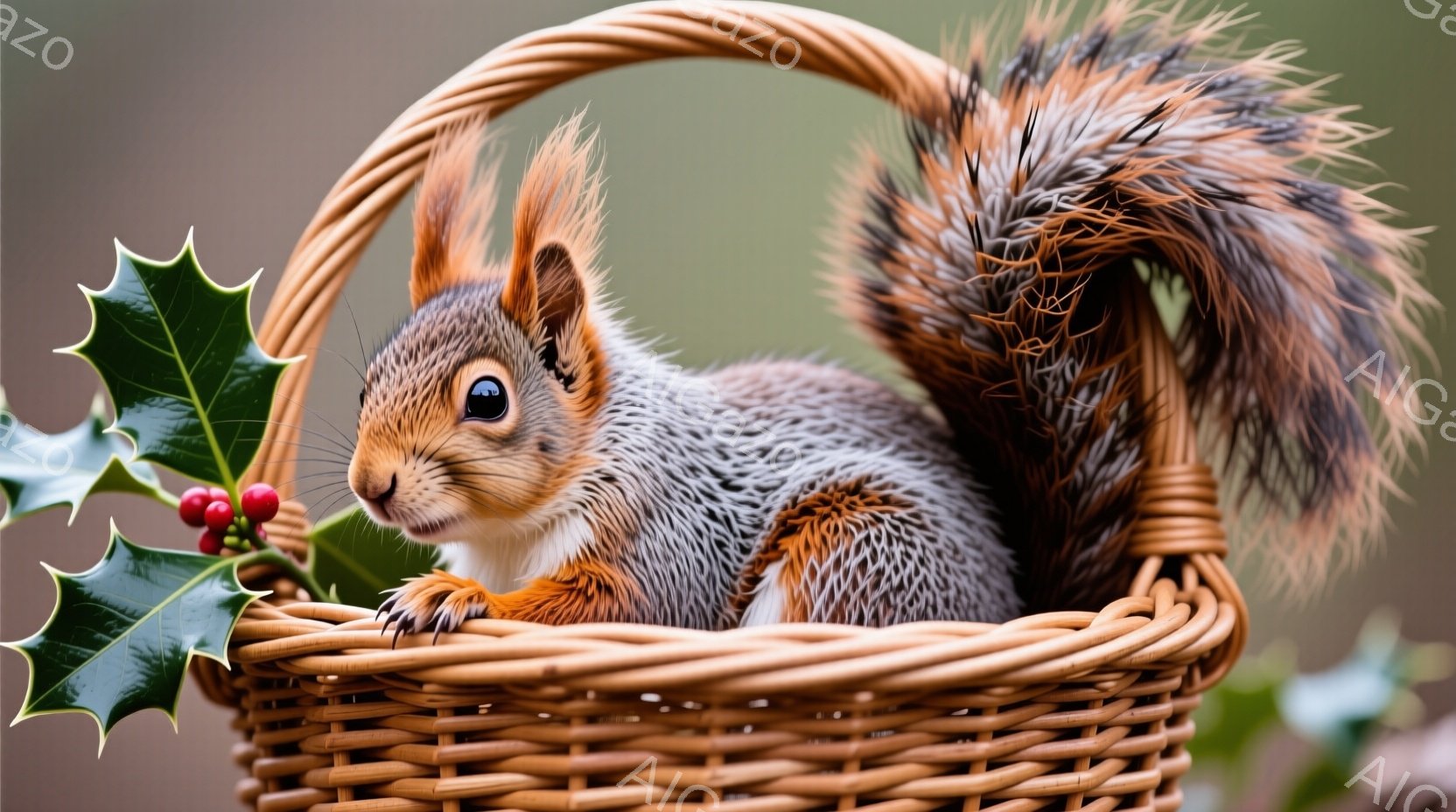 籠の中に、毛並みの美しい赤褐色のリスが丸まって座っています。リスは前足で籠の縁につかまり、好奇心とわずかな警戒心を含んだ表情でこちらを見つめています。背景には緑の葉と赤い実が添えられ、冬の暖かい雰囲気を醸し出しています。
