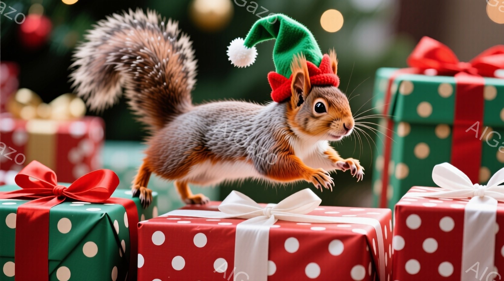 リスがクリスマスプレゼントの山の上で飛び跳ねています。緑と赤のギフトボックスには赤いリボンと白い飾りがあり、リスは頭に緑色のサンタの帽子をかぶっています。背景はぼやけており、クリスマスツリーの緑とキラキラ光るライトが見え、暖かくお祝いムードを醸し出しています。