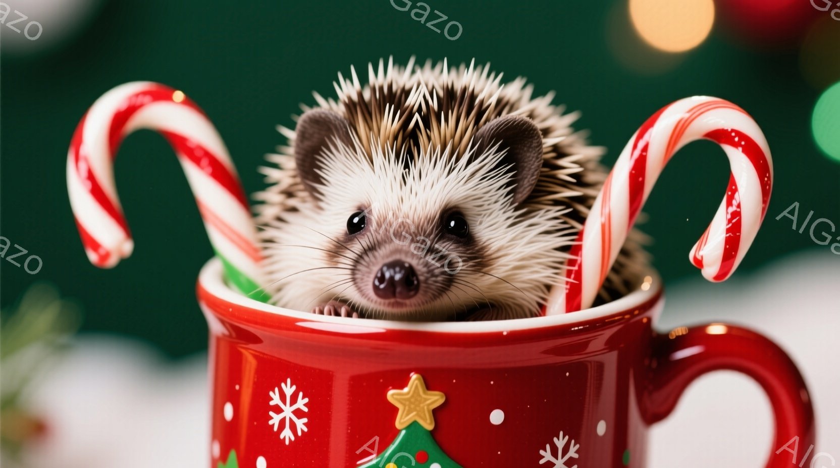 かわいいハリネズミが赤いクリスマス柄のマグカップの中に座っています。その周りにはキャンディケーンが挿され、背景には緑色のぼやけたクリスマスツリーやプレゼントが見え、雪が降っているような白い粒子が散りばめられています。全体的に暖かく、お祝いムードにあふれた、可愛らしい雰囲気です。