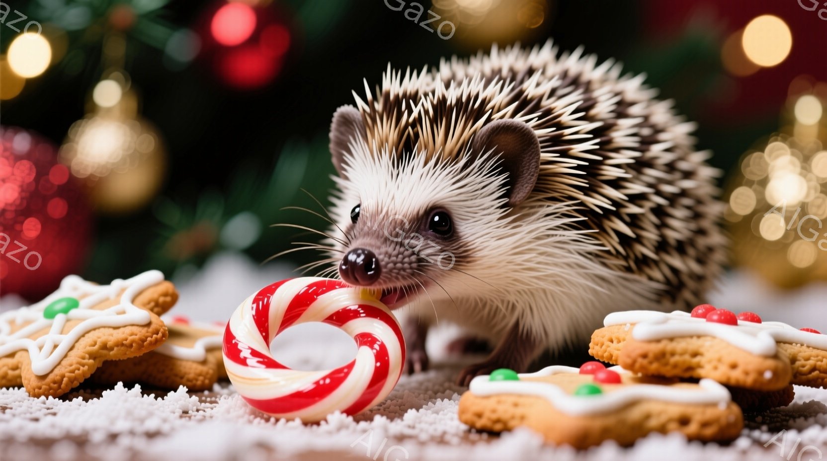 白い雪の上に、可愛らしいハリネズミが赤い縞模様のキャンディをくわえています。周りには、クリスマスツリーの飾りと、アイシングで飾られたクッキーが散らばり、クリスマスの温かい雰囲気を演出しています。ハリネズミは小さな瞳でこちらを見つめ、愛らしい表情をしています。