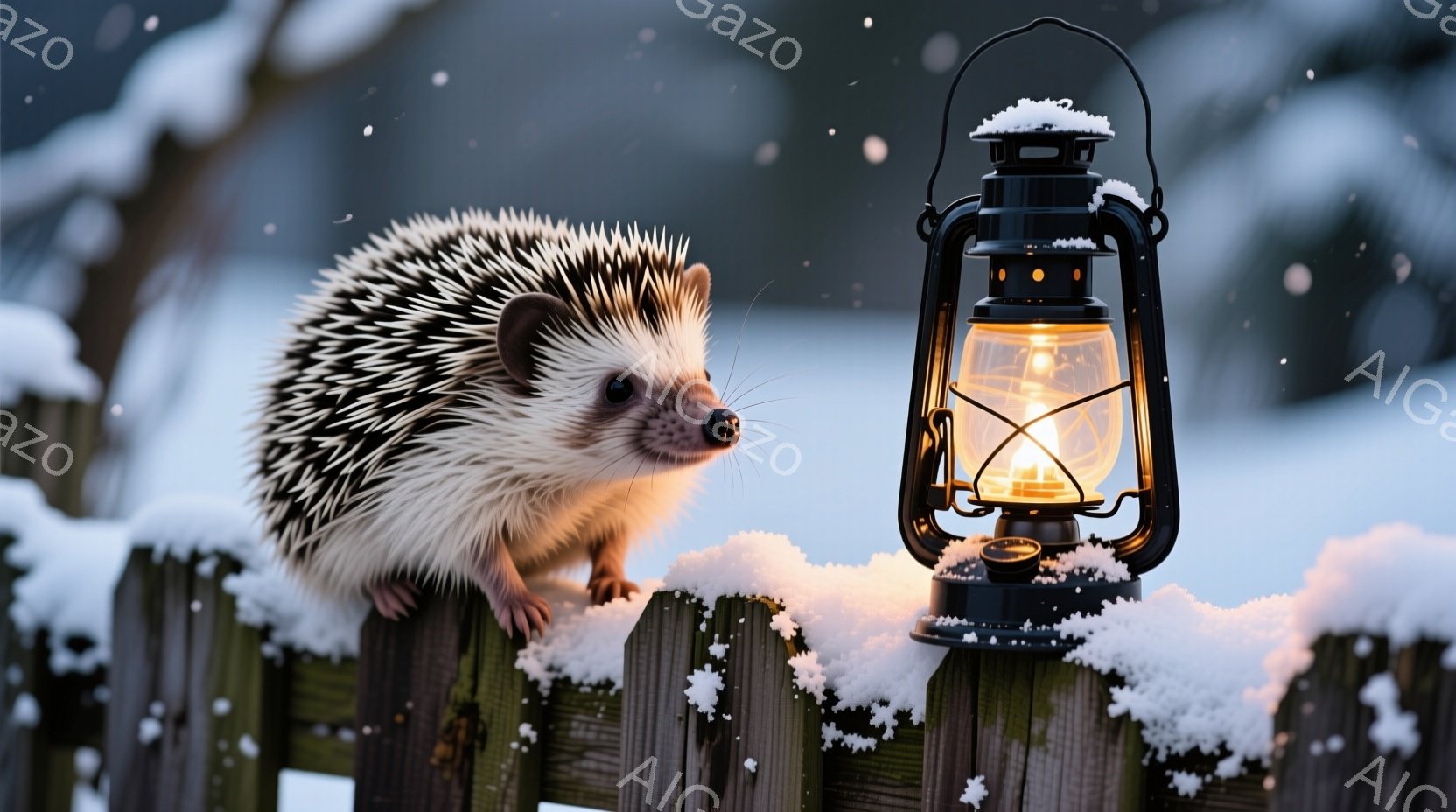 雪が降る寒い冬の日に、柵の上に可愛らしいハリネズミが立っている。その隣には、暖かく光る古いランタンが置かれ、周囲の雪景色を照らしている。ハリネズミは小さな目で何かを見つめ、少し警戒しているような表情をしている。