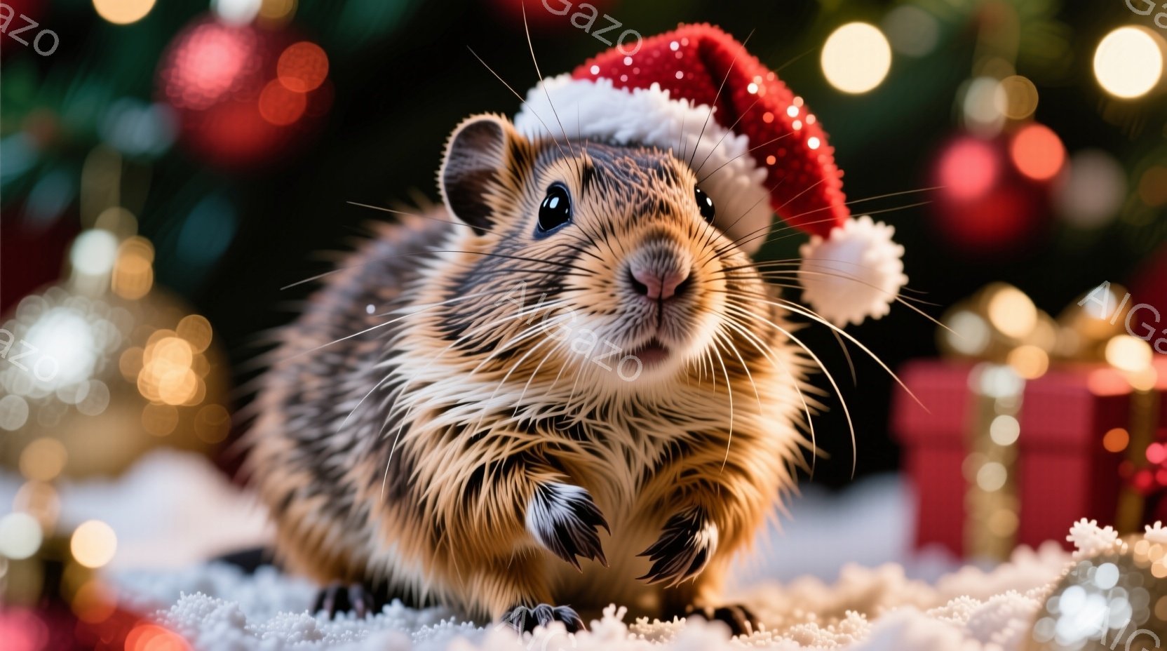 ハムスターが頭に赤いサンタ帽をかぶり、雪の上に座っています。つぶらな瞳でカメラを見つめており、愛らしい表情をしています。背景には、緑色のクリスマスツリー、金色のオーナメント、緑色のギフトボックスが散りばめられ、雪が舞う冬の温かい雰囲気が漂っています。