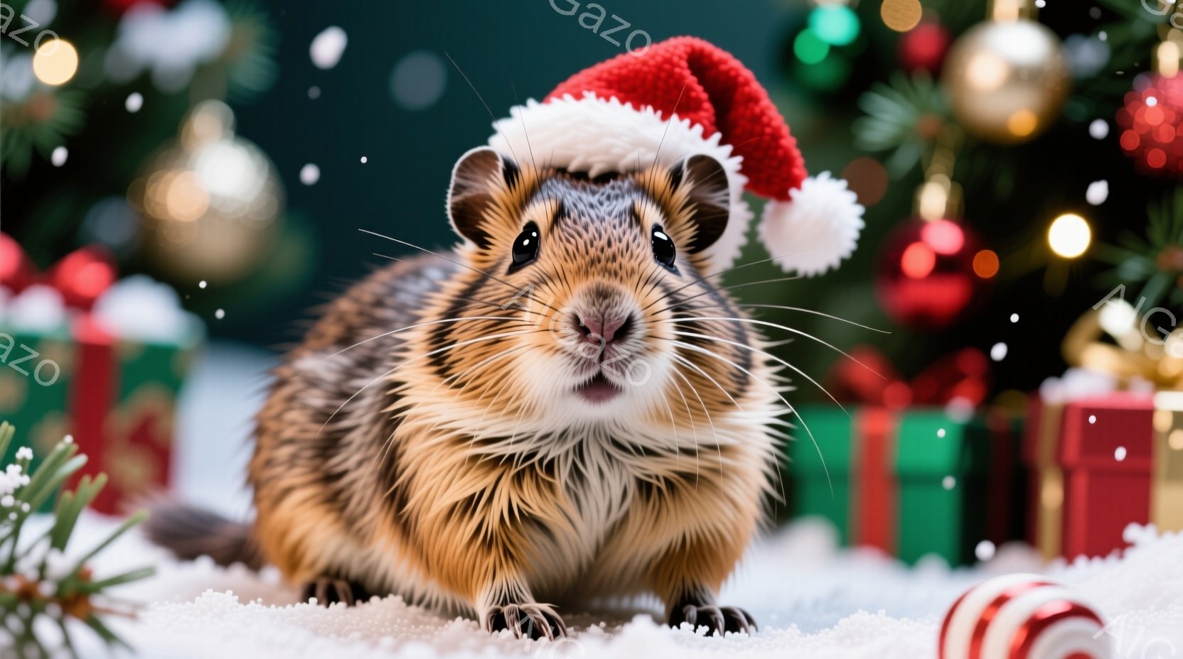 この無料AI生成画像「白と茶色の毛並みを持つモルモットが、クリスマス柄のクッションの上に座っており、頭にはサンタの帽子をかぶっています。モルモットは正面を見ており、丸い目で可愛らしい表情をしています。背景にはぼやけたクリスマスツリーとプレゼントが見え、暖かくお祝いムードが漂っています。」は、2025年10月25日に作成されました。 サイズは 1664×928px の高解像度で、商用利用も可能なフリー素材として提供しています。