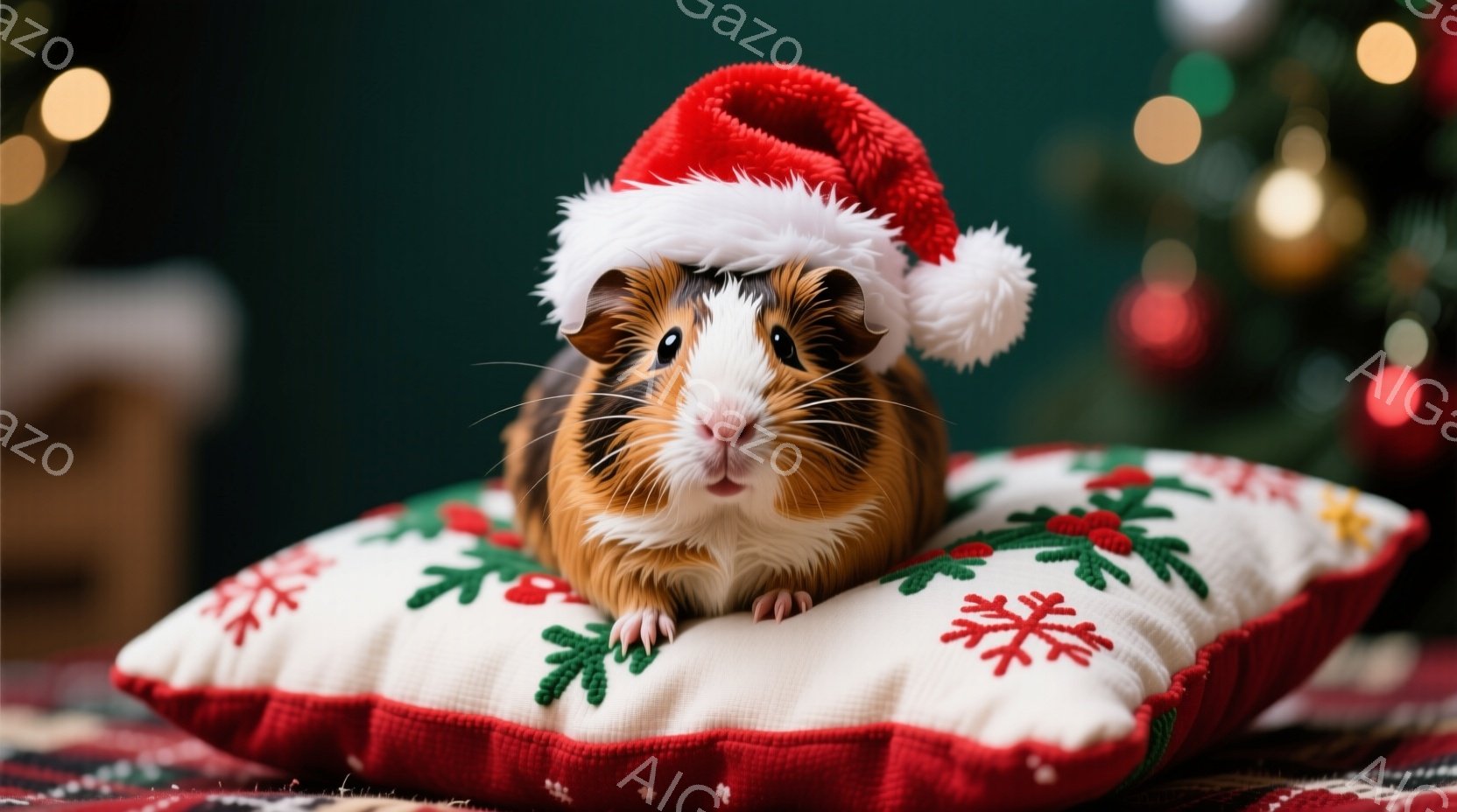白と茶色の毛並みを持つモルモットが、クリスマス柄のクッションの上に座っており、頭にはサンタの帽子をかぶっています。モルモットは正面を見ており、丸い目で可愛らしい表情をしています。背景にはぼやけたクリスマスツリーとプレゼントが見え、暖かくお祝いムードが漂っています。
